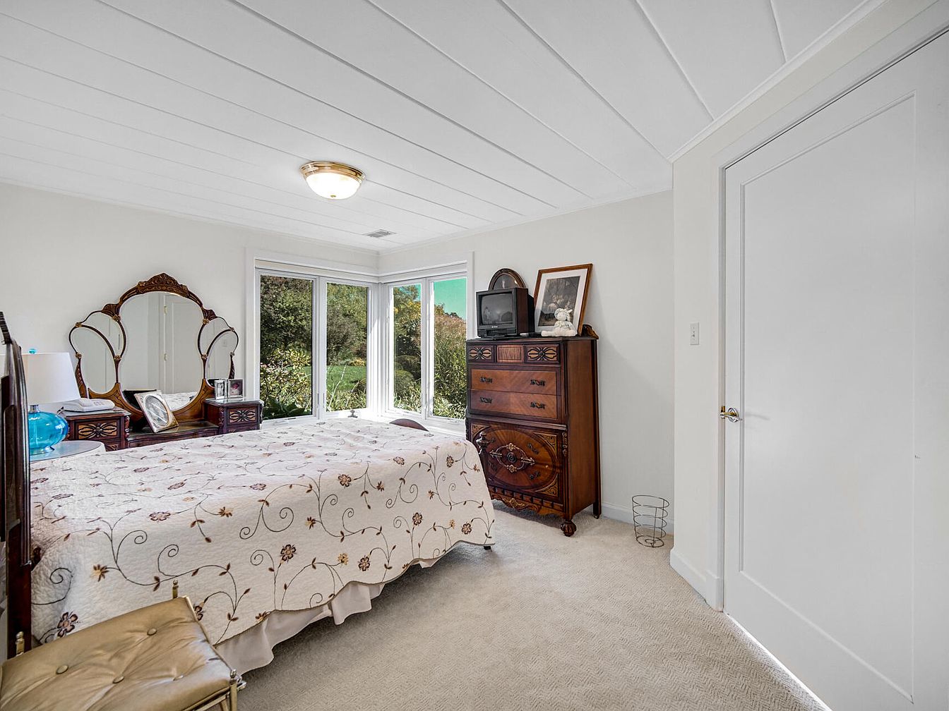 This cozy bedroom features a soft cream color palette with plush carpeting, creating a warm and welcoming space ideal for families. A large window fills the room with natural light and offers a serene view of the greenery outside, perfect for relaxation. The space is furnished with a vintage wooden vanity with an ornate mirror, a matching wooden dresser with classic details, and a simple cushioned bench. The bedspread is light with delicate floral embroidery, adding a charming touch. The uncluttered layout offers easy movement, making it safe and comfortable for all family members.