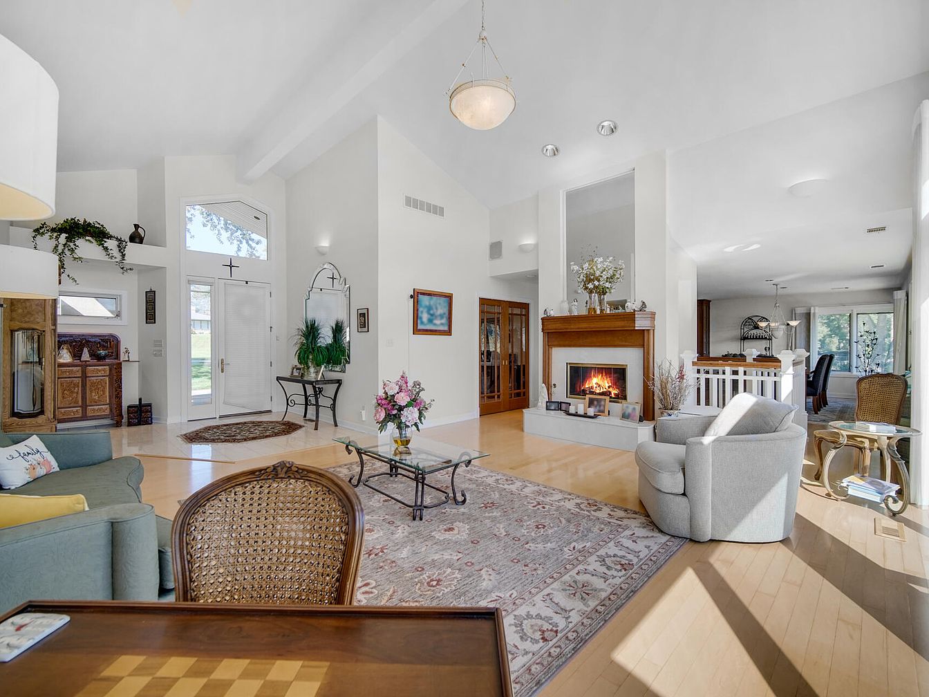 A spacious and welcoming living room features an open layout ideal for family gatherings, with tall vaulted ceilings and abundant natural light streaming in through large windows and a glass front door. A cozy fireplace with a wooden mantle serves as the visual focal point, surrounded by plush seating including a light gray armchair and a pale green sofa adorned with colorful cushions. Soft wood flooring and a patterned area rug add warmth and comfort, while thoughtful touches such as fresh flowers, greenery on console tables, and elegant glass coffee and side tables complete the friendly, refined atmosphere. Neutral walls enhance the airy, inviting feel.