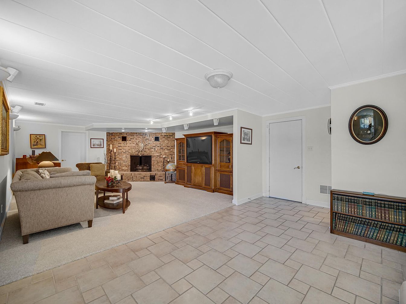 Spacious and inviting, the family room offers an open floor plan perfect for both relaxation and gatherings. The centerpiece is a red brick fireplace, adding warmth and character to the space. To one side sits a large entertainment center, ideal for family movie nights, while a comfortable tan sectional sofa and matching armchair create a cozy conversation area atop plush carpeting. Neutral tones dominate the color scheme, including light gray-beige walls and soft cream ceilings. The room features ample lighting with overhead fixtures and track lights, a built-in bookshelf, and a sturdy tiled entry, ensuring easy maintenance and a family-friendly, welcoming environment.