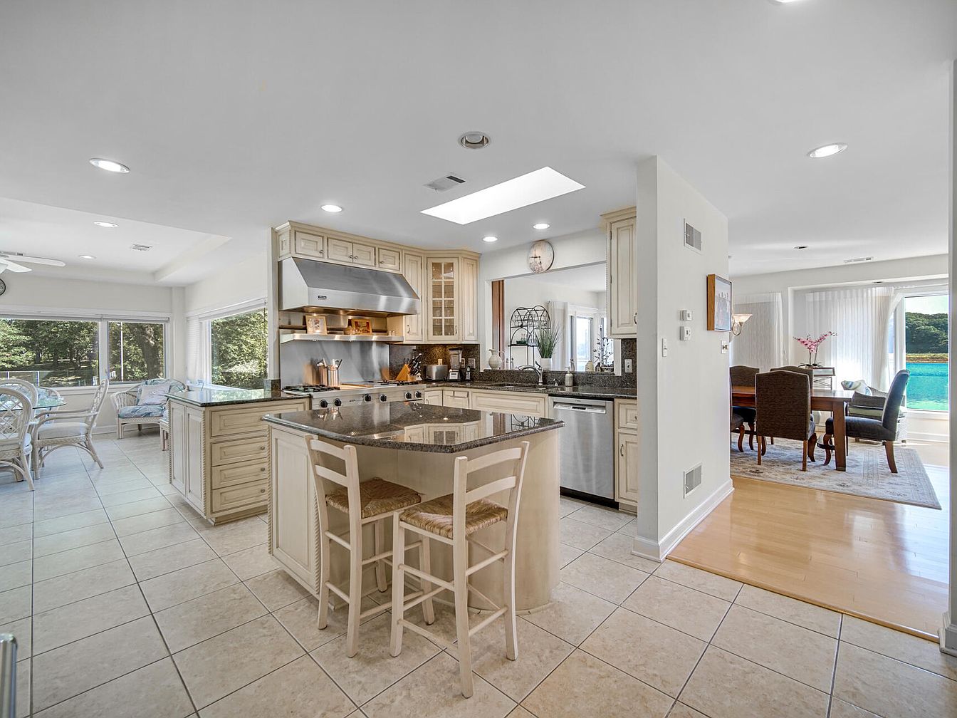This spacious open-concept kitchen features cream cabinetry, granite countertops, and stainless steel appliances, all illuminated by natural light from large windows surrounding the adjacent breakfast nook. A central island with bar seating encourages gathering or casual family meals, while ample counter space and cabinetry provide practicality for busy households. The kitchen opens seamlessly to a formal dining area with elegant wood flooring and dark upholstered chairs surrounding a polished table, perfect for family dinners or entertaining. Soft neutral tones, tiled floors in high-traffic areas, and uncluttered design create a welcoming, family-friendly environment with a harmonious flow throughout.