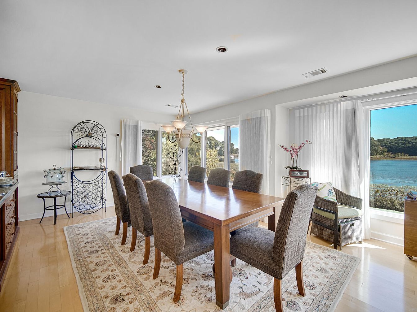 Spacious and inviting dining room with a large wooden table surrounded by eight cushioned chairs, perfect for family meals or gatherings. Natural light fills the space from broad windows that offer picturesque views of a serene lake and lush greenery, creating a calm and welcoming atmosphere. The soft neutral palette, featuring cream walls and a light floral-patterned area rug, enhances the airy feel. Decorative elements include a wrought-iron shelving unit and a small side table for serving or display. A comfortable wicker chair by the window provides an ideal reading nook or extra seating, adding to the family-friendly ambiance.