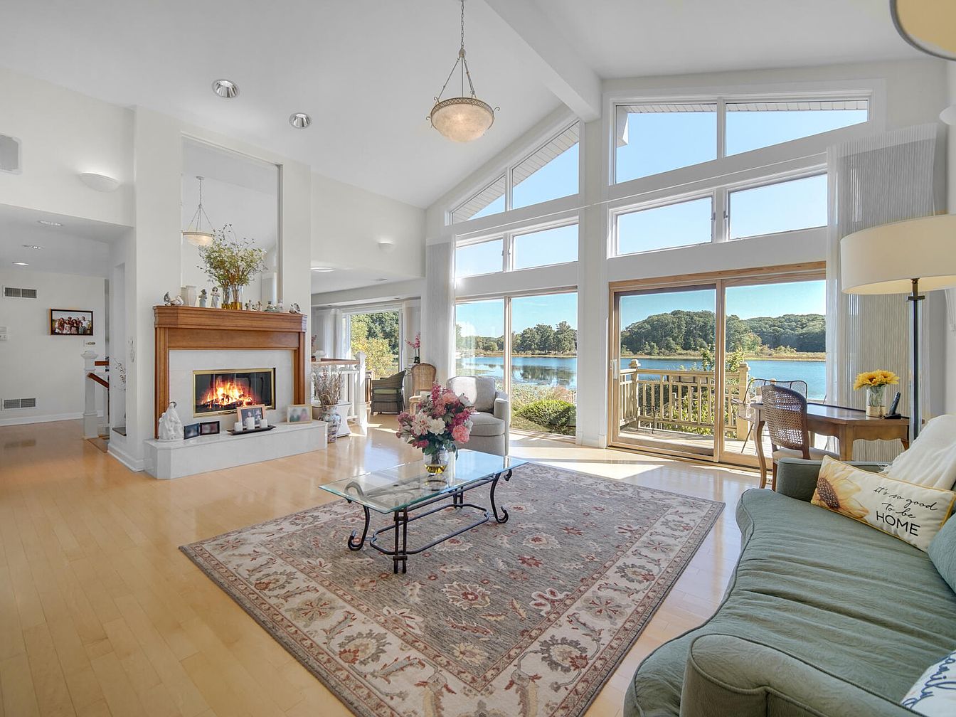 A spacious, sun-filled living room with large floor-to-ceiling windows offering a panoramic lake view, perfect for family gatherings. Natural light floods the room, highlighting pale wood floors and soft white walls, which create an airy, welcoming environment. The focal point is a warm, elegant fireplace framed in natural wood and white stone, with floral arrangements and family photos on the mantel. Comfortable seating includes a green couch and cushioned chairs, complemented by a decorative area rug with subtle earth tones. A glass-top coffee table sits central, while a writing desk by the window provides a cozy family workspace. Sliding doors lead to a lakeside deck, enhancing indoor-outdoor living.