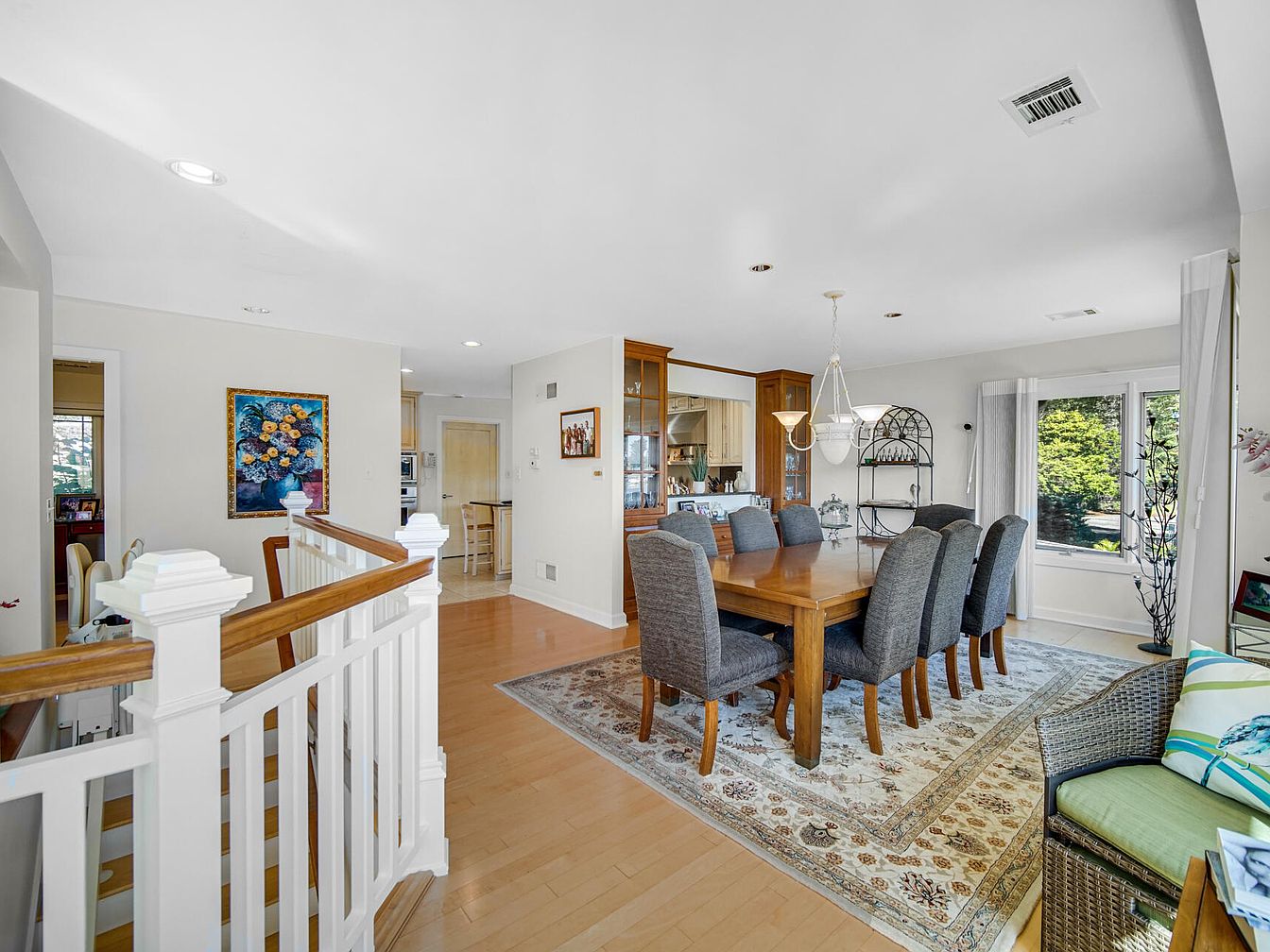 This open dining area features a spacious wooden table with seating for eight, ideal for family gatherings or entertaining guests. Plush gray upholstered chairs surround the table, all set on a large, ornate area rug that adds warmth and elegance. The room benefits from ample natural light through wide, double windows adorned with light sheer curtains. Adjacent to the dining space, a cozy sitting nook with a wicker bench creates a family-friendly spot for conversation or reading. Light honey-toned wood flooring and creamy walls enhance the airy, welcoming feel, while tasteful artwork and decorative lighting fixtures contribute to a polished, homey atmosphere.
