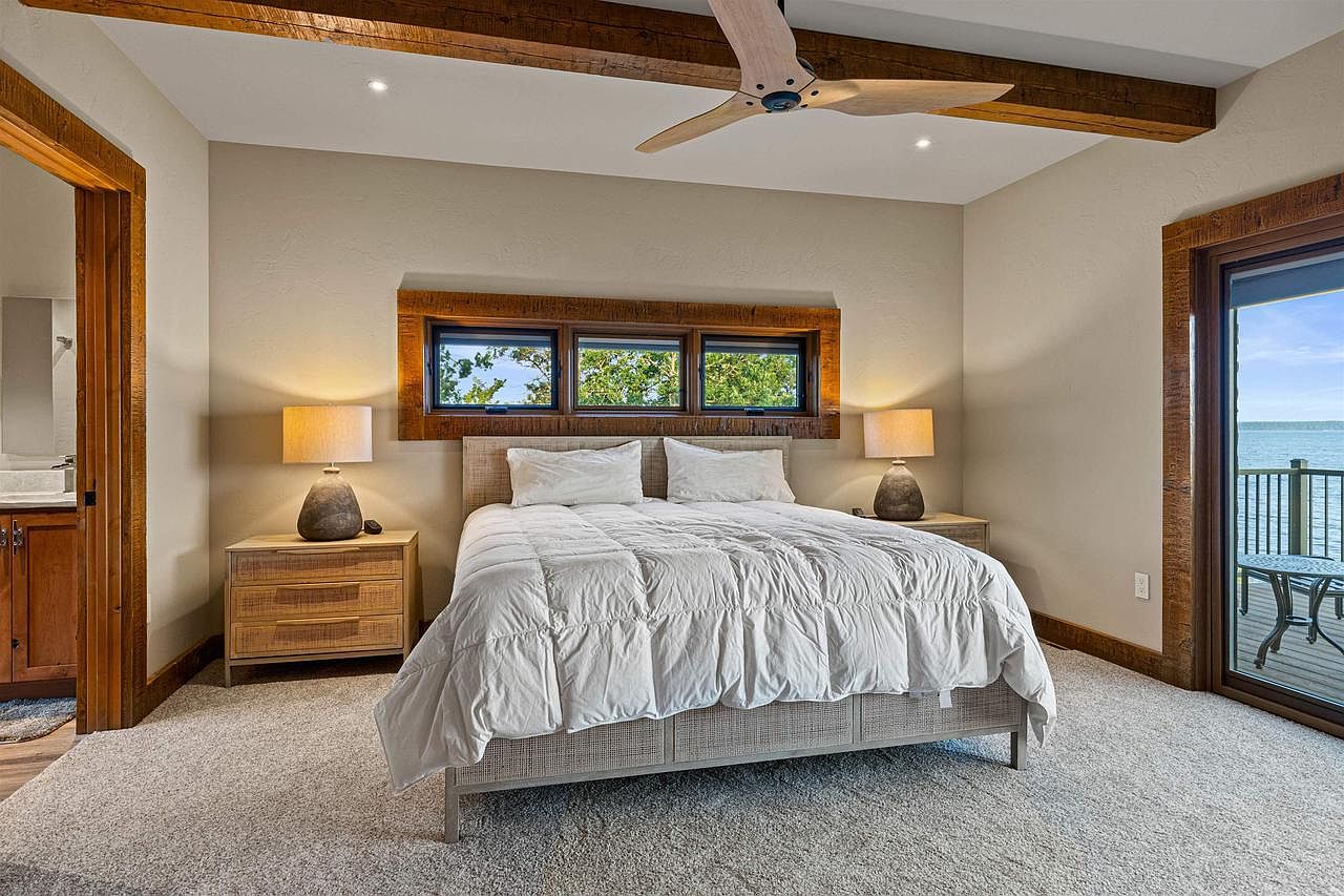 This serene bedroom features a large bed with a white comforter set against a wall with three horizontal windows framed in rich wood, allowing natural light and greenery views. The room includes two matching bedside tables, each with a neutral lamp adding a warm, cozy glow. Natural wood beams run along the ceiling, complementing the earthy beige walls and plush, soft carpeting underfoot. A sliding glass door opens to a balcony with water views, perfect for peaceful family mornings. The ensuite bathroom is conveniently accessed, while the room’s gentle color palette and clean lines make it especially welcoming for families.