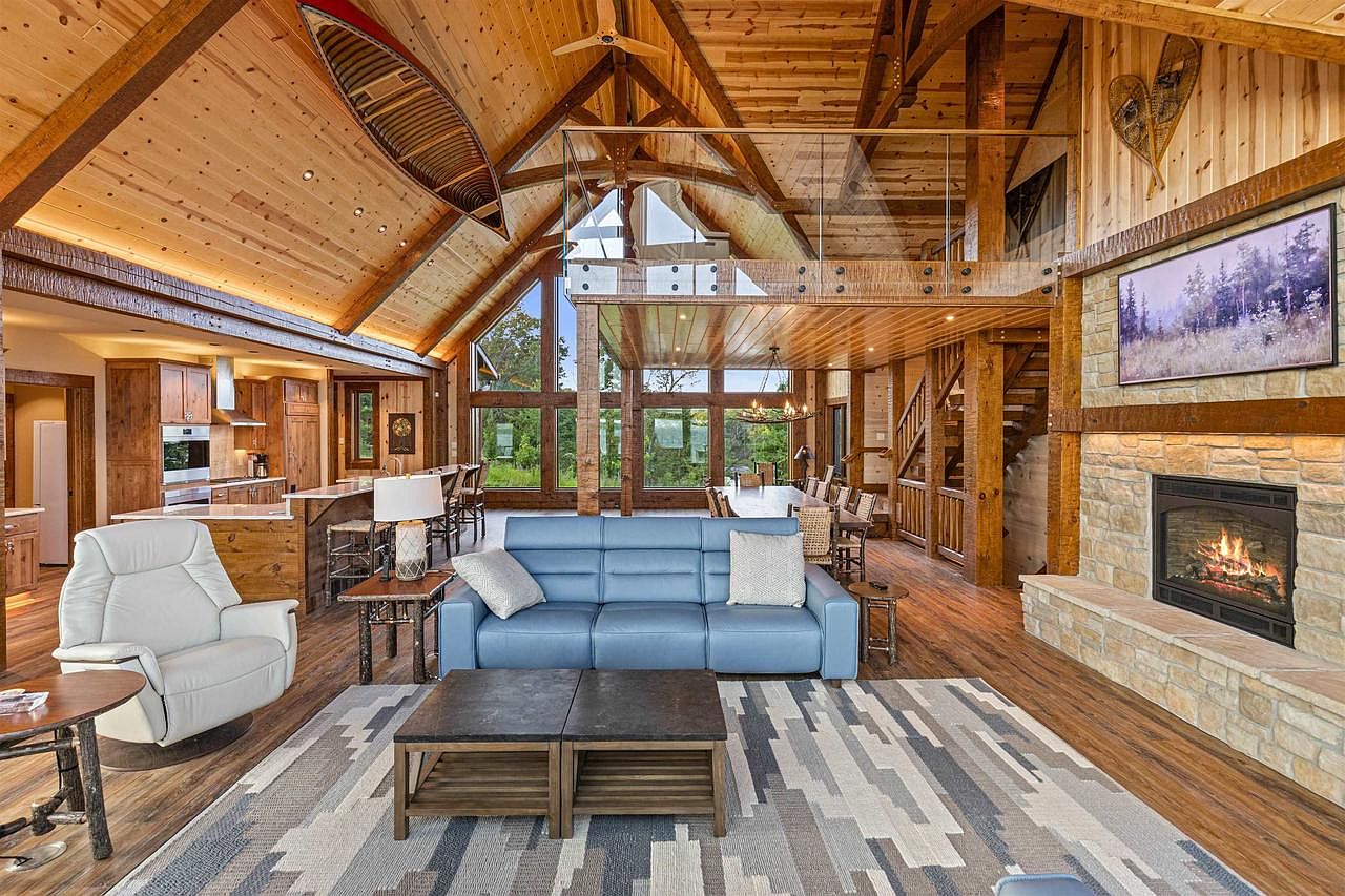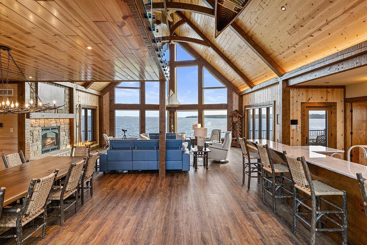 Expansive great room highlights a warm, inviting space perfect for families. Tall vaulted ceilings clad in honey-toned wood create an airy, open atmosphere, while floor-to-ceiling windows frame breathtaking waterfront views and flood the area with natural light. A cozy stone fireplace anchors the seating area, surrounded by a plush blue sectional and neutral armchairs, offering a relaxed spot for conversation or movie nights. The open concept includes a large rustic dining table and a breakfast bar with woven-back stools, ideal for family meals or entertaining guests. Durable wood flooring completes this harmonious, nature-inspired retreat.