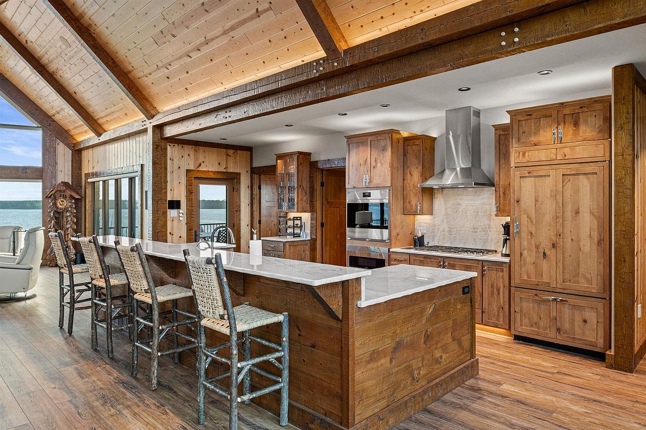A spacious kitchen features a large island with a gleaming white marble countertop, offering ample seating for four on woven wooden barstools. Warm, natural wood cabinetry and paneling create a cozy, rustic feel, complemented by exposed wooden beams on the vaulted ceiling. Stainless steel appliances, including a large oven and vent hood, add modern functionality. The open layout flows into a living area with large windows, providing scenic lake views and natural light. Easy-to-clean flooring and durable surfaces make this space family-friendly, perfect for gatherings, meal prep, and shared time together in a welcoming environment.