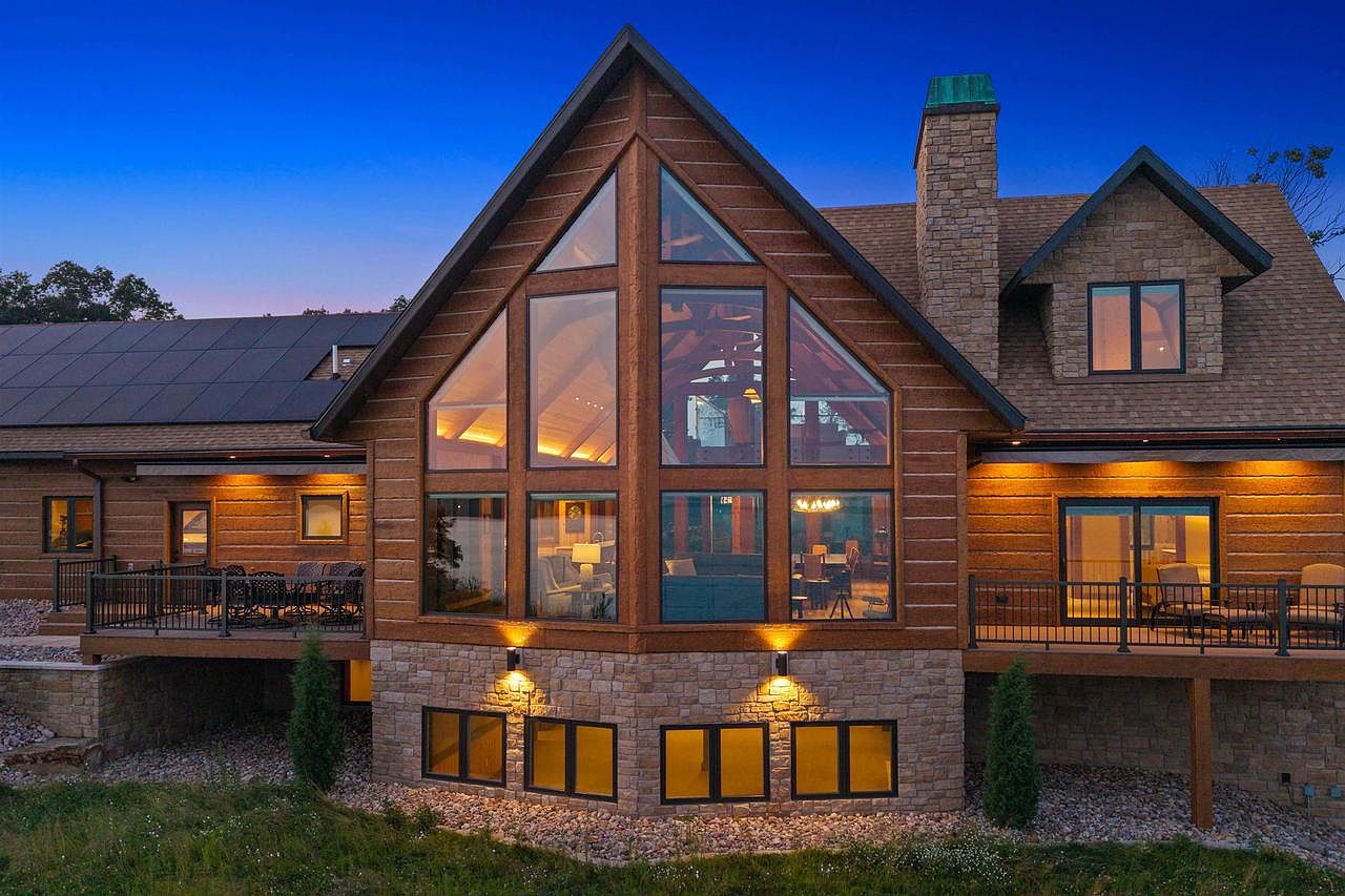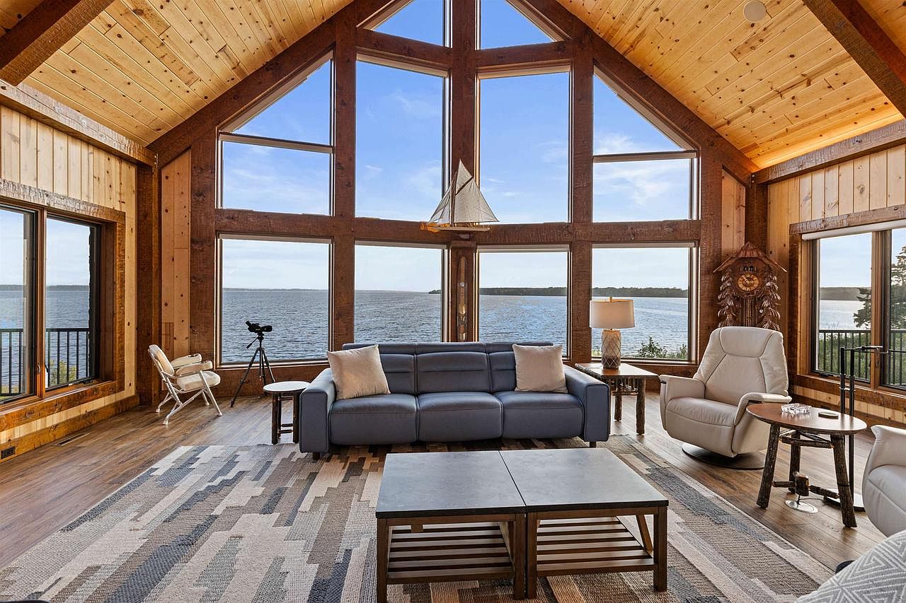 This brand-new Golden Eagle Timber Frame home, built in 2024, embodies modern lakeside luxury on a coveted lot in Nekoosa, Wisconsin, with 420 feet of private frontage along the state’s second-largest lake. Blending rustic elegance and contemporary innovation, its open-concept design and panoramic triple-pane Pella windows offer breathtaking 270-degree water views, ideal for family gatherings and entertaining. High-end finishes, such as hand-hewn timbers, custom cabinetry, designer lighting, and a smart Control4 automation system, enhance daily comfort. The home features expansive indoor/outdoor spaces, in-floor heating, and a solar system, promising energy efficiency and year-round living. Priced at $3,750,000, this one-of-a-kind property boasts a prime lakeside location, low-maintenance exterior, and top-tier amenities for luxury family life.