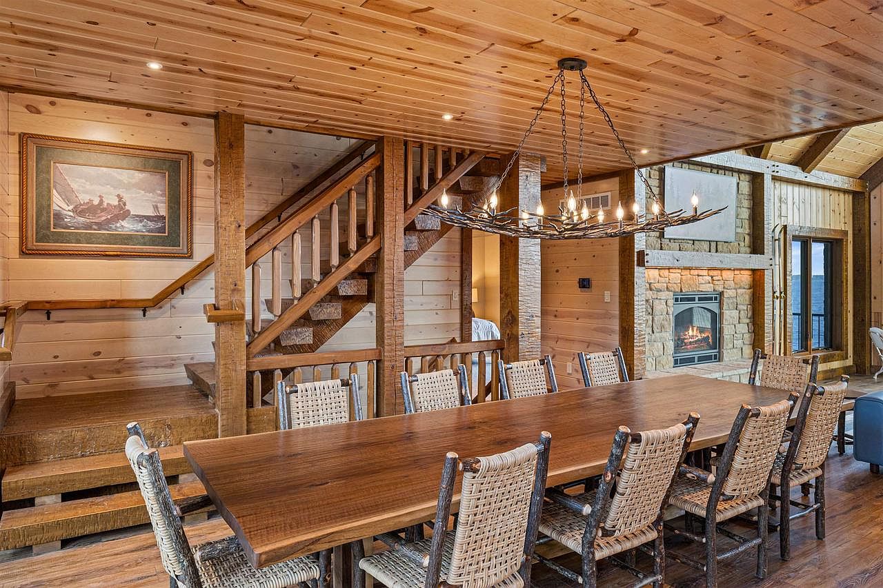 A spacious open-plan dining area featuring a long, sturdy wooden table with seating for ten, perfect for large family gatherings or shared meals. The room glows with natural wood finishes on the walls, ceiling, and floor, creating a warm, inviting cabin-like atmosphere. A striking antler-style chandelier hangs above the table, adding rustic charm. Nearby, a stone fireplace provides both comfort and a focal point, while big windows offer ample natural light. A staircase with thick timber railings leads to an upper level, enhancing the sense of space and flow. Family-friendly elements include durable materials and open sight lines.