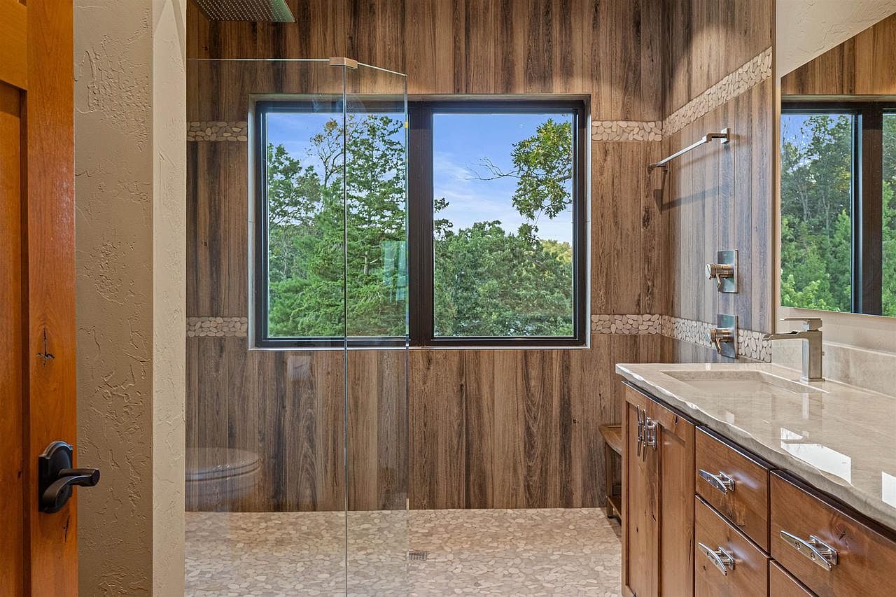 This spacious bathroom features a walk-in shower with a glass partition, offering a modern, airy feel. The walls have a rich, wood-grain finish accented by decorative stone tile bands that add texture and warmth. Large picture windows frame views of lush greenery and flood the space with natural light, creating a calming atmosphere for families. The vanity includes sturdy wood cabinetry with sleek metal hardware and a polished stone countertop, providing ample storage and a durable surface for busy households. The neutral earth tones throughout enhance the sense of tranquility and make maintenance simple, supporting a family-friendly environment.