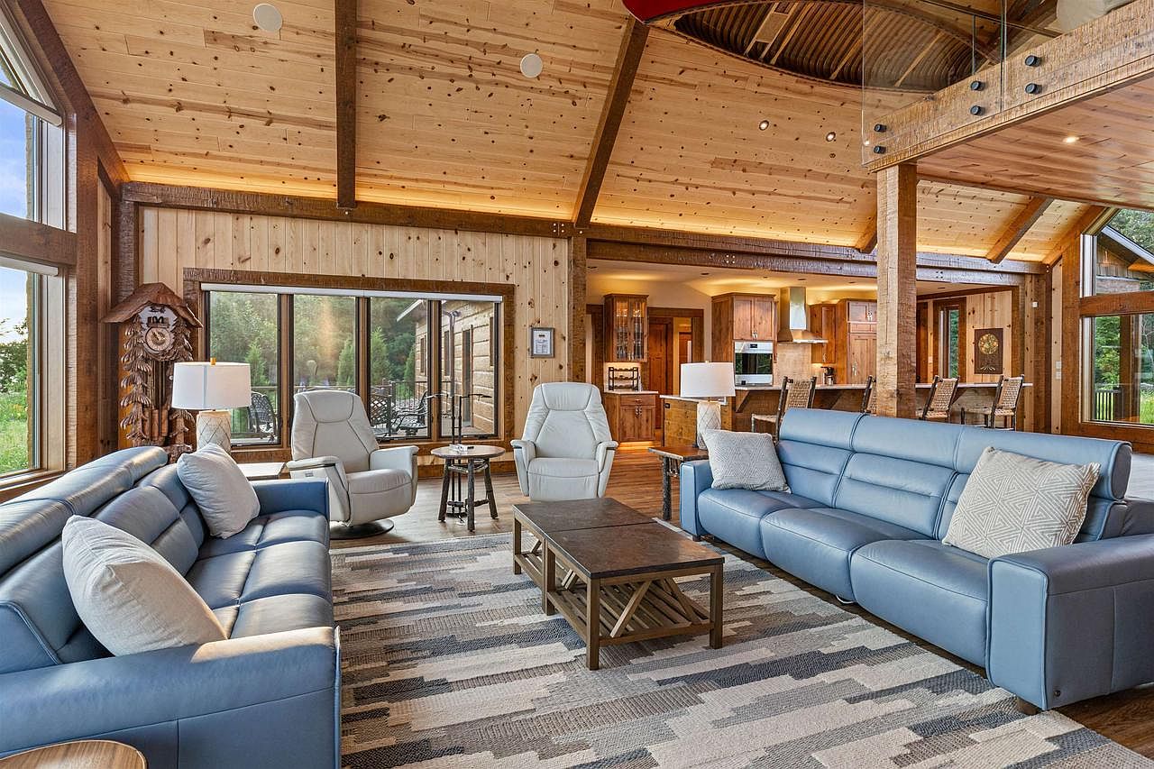 A spacious, open-concept living room features high vaulted ceilings finished in natural wood, bringing warmth and character to the space. Large picture windows on three sides flood the area with natural light and offer peaceful views of the outdoors, while blue leather couches and pale armchairs provide comfortable seating for the whole family. A geometric area rug in shades of gray and cream softens the hardwood floor, creating a welcoming play or gathering area. The adjacent kitchen and breakfast bar are easily accessible, making it perfect for family interaction and entertaining. Soft accent lighting completes this inviting atmosphere.