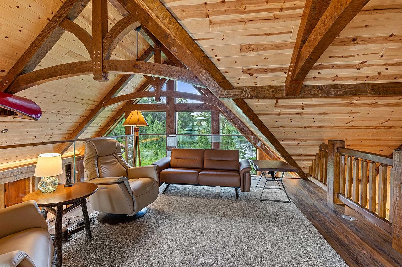 A cozy loft sitting area features warm wooden beams overhead and tongue-and-groove pine walls and ceiling that create a relaxing, cabin-like atmosphere. The space includes comfortable tan leather recliners and a matching two-seat sofa arranged around rustic wood tables with soft lighting from a floor and table lamp. Plush, neutral-toned carpet adds to the family-friendly comfort, making it an inviting spot for reading or relaxing. Large windows at the end of the loft allow natural light to pour in while offering views of lush greenery outside. The sturdy wood and glass railing ensures safety for families, adding to its welcoming appeal.