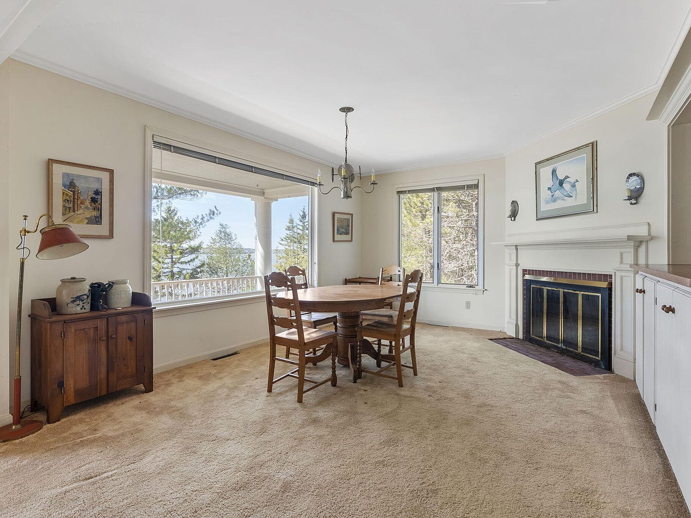 This cozy dining room showcases a warm beige carpet that adds comfort to the space. A round wooden table surrounded by matching chairs occupies the center, inviting gatherings. Large windows allow natural light to flood in, revealing views of surrounding trees. Nearby, a vintage sideboard displays decorative items, hinting at a rustic charm. Wall-mounted sconces provide soft lighting, enhancing the room’s ambiance. Artworks adorn the walls, adding character and personal touch, while a simple fireplace, framed in elegant white molding, serves as a focal point, contributing to the room’s inviting atmosphere.