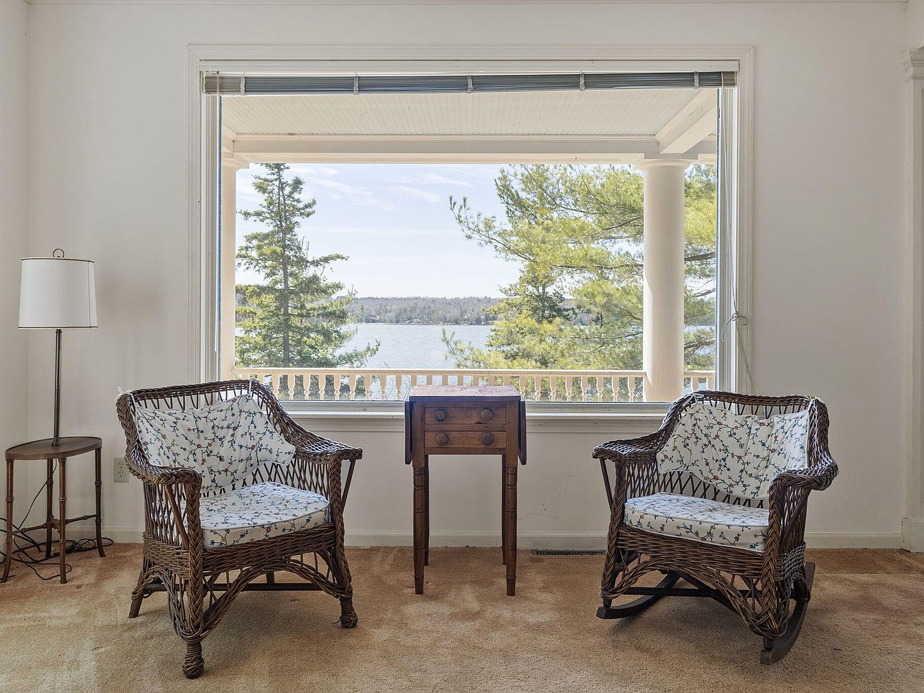 This sunroom features a tranquil seating area with two wicker chairs adorned with floral-patterned cushions, creating a cozy atmosphere. A small wooden side table sits between the chairs, adding practicality to the space. Large windows frame a picturesque view of a serene lake, inviting natural light and outdoorsy charm. The walls are painted in a soft, light hue, enhancing the airy feel. Below, plush, neutral-toned carpet offers warmth and comfort underfoot. Decorative elements include a simple table lamp, contributing to the inviting and relaxing vibe of this peaceful retreat, ideal for enjoying scenic views.