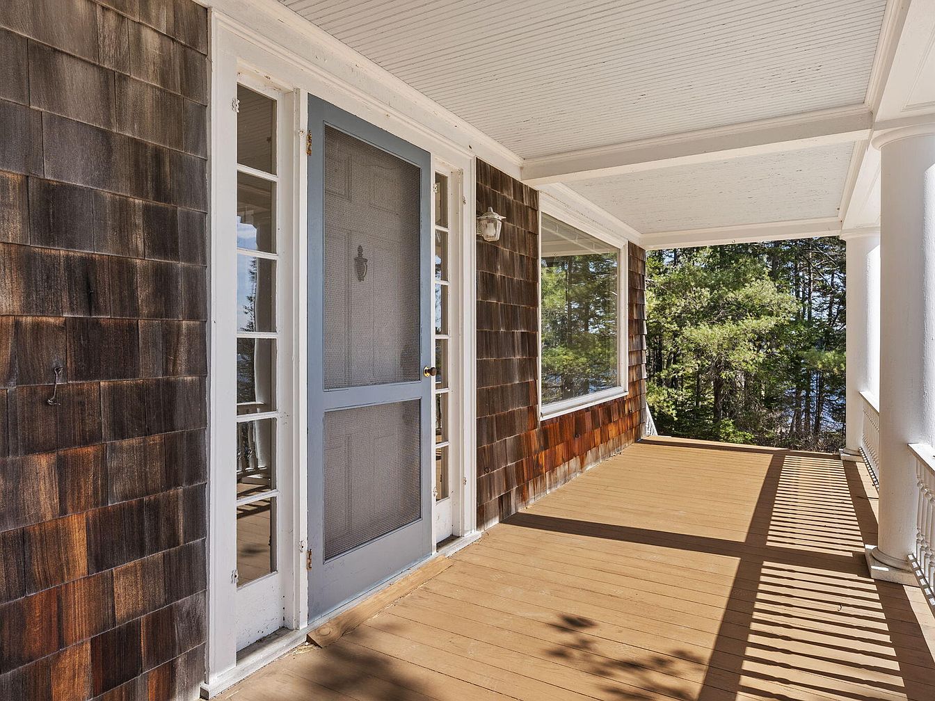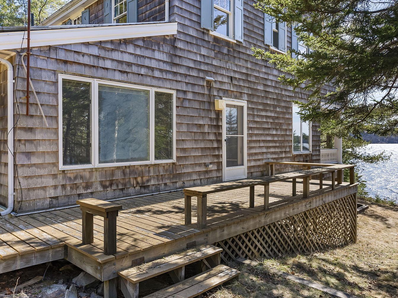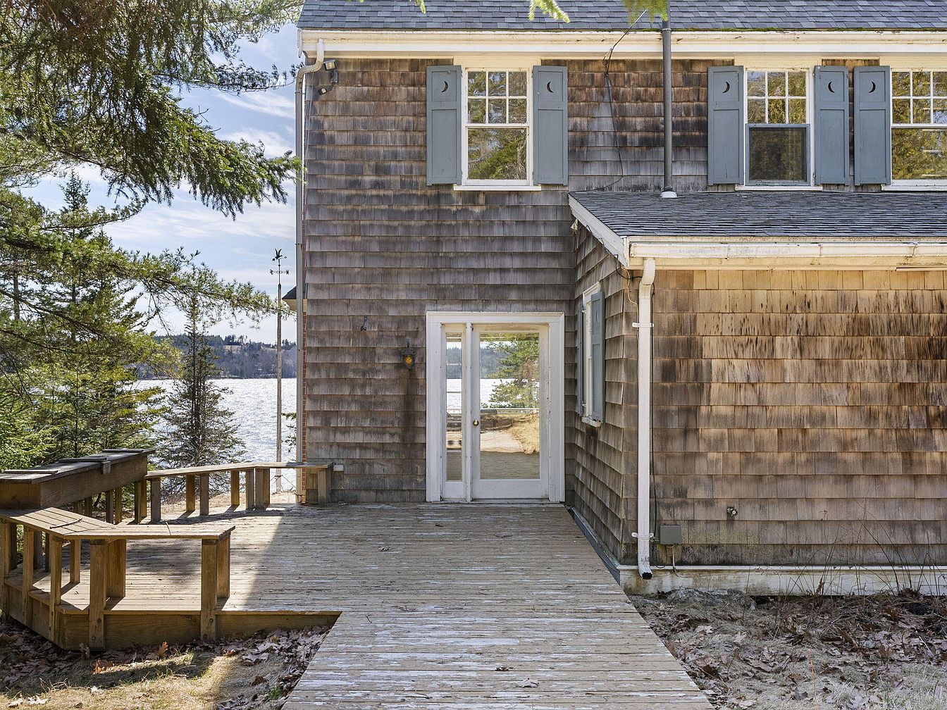 This image shows the back entrance of a historic American home, featuring wooden shingle siding that reflects a rustic charm. The door, framed with simple white trim, opens to reveal a serene view of the water just beyond the wooden deck. Blue shutters accentuate the windows, adding a touch of coastal style. The deck is made of natural wood, blending harmoniously with the surrounding greenery, while the slight weathering suggests a well-loved space. Surrounded by trees, the setting evokes a peaceful retreat atmosphere, inviting outdoor living and connection to nature.