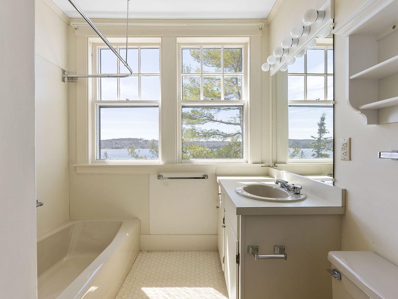A bright and airy bathroom featuring two large windows that frame an idyllic lakeside view. The soft, neutral palette of the walls and cabinetry enhances the light, creating a serene atmosphere. A sleek white bathtub runs along one wall, complementing the modern vanity area, which showcases a circular sink atop a cleanly designed counter. Above the sink, a row of spherical light fixtures provides warm illumination. Textured hexagonal tiles cover the floor, adding visual interest while maintaining the room’s understated elegance. The overall design reflects a harmonious blend of functionality and aesthetic appeal.