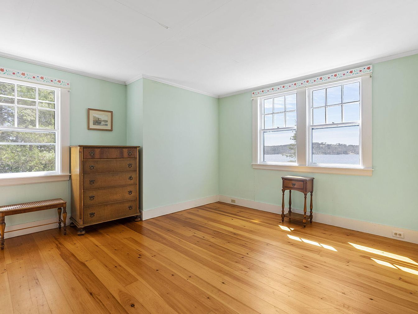 A serene bedroom atmosphere emerges with pale green walls that enhance the natural light streaming through two large windows. Below, warm, honey-toned hardwood flooring creates a cozy contrast with the wall color. A simple wooden dresser with rounded edges stands against one wall, its craftsmanship adding a vintage charm. Nearby, a small, intricately designed side table complements the dresser, reinforcing the room’s rustic elegance. The windows are adorned with a delicate floral valance, softening the edges and drawing the eye to the picturesque view outside. Overall, this space embodies tranquility, inviting relaxation and peaceful retreat.