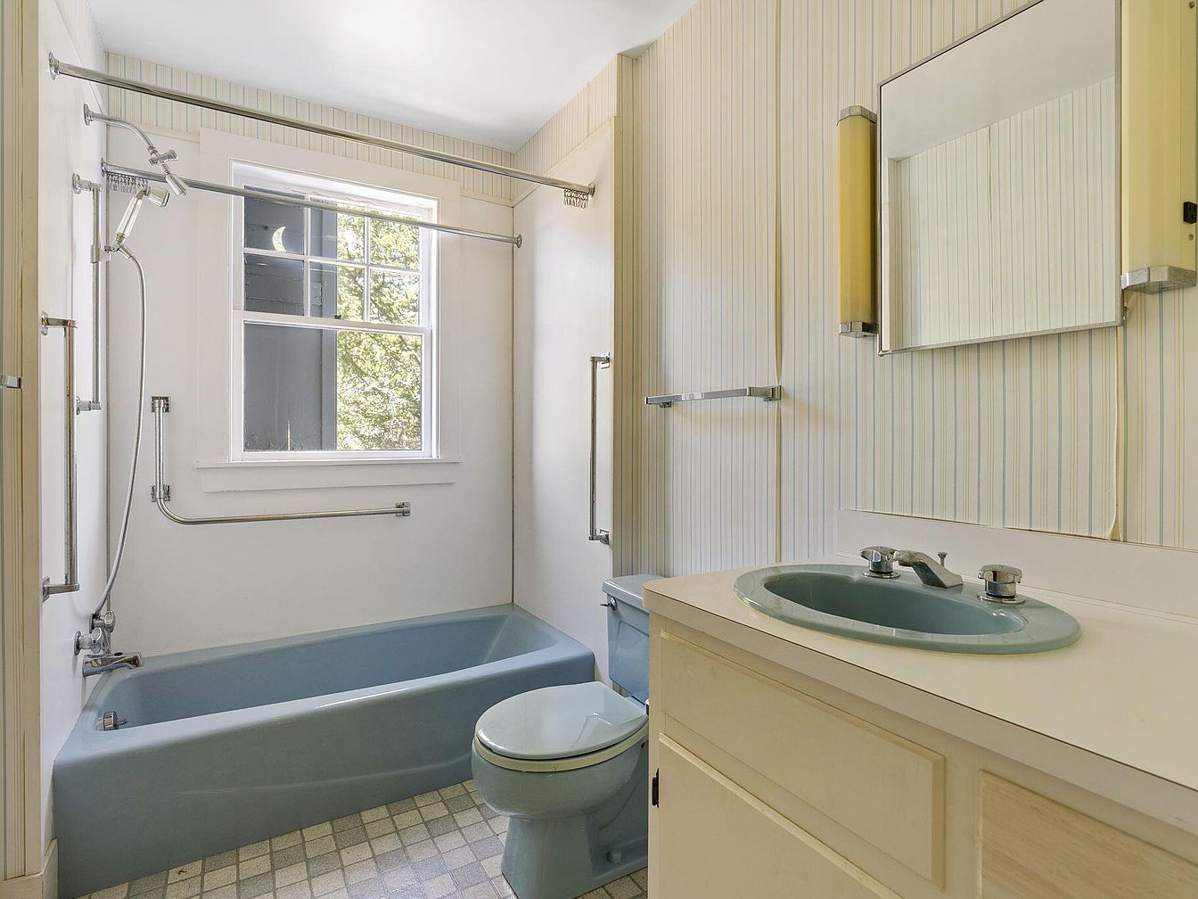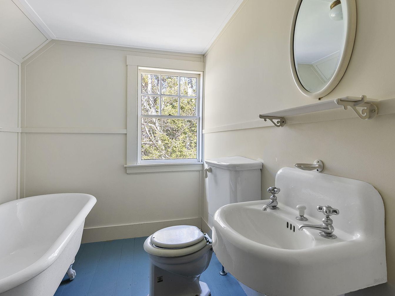 This vintage bathroom features a classic clawfoot tub opposite an elegant pedestal sink and a low-profile toilet. Walls are painted in soft beige with white trim that adds a touch of brightness. A large window allows natural light, enhancing the airy atmosphere while offering a serene view of greenery outside. The light blue floor adds a refreshing pop of color, contrasting beautifully with the white fixtures. An oval mirror above the sink emphasizes simplicity and functionality. Minimalist shelving next to the sink provides practical storage, maintaining the uncluttered and timeless aesthetic of the space.