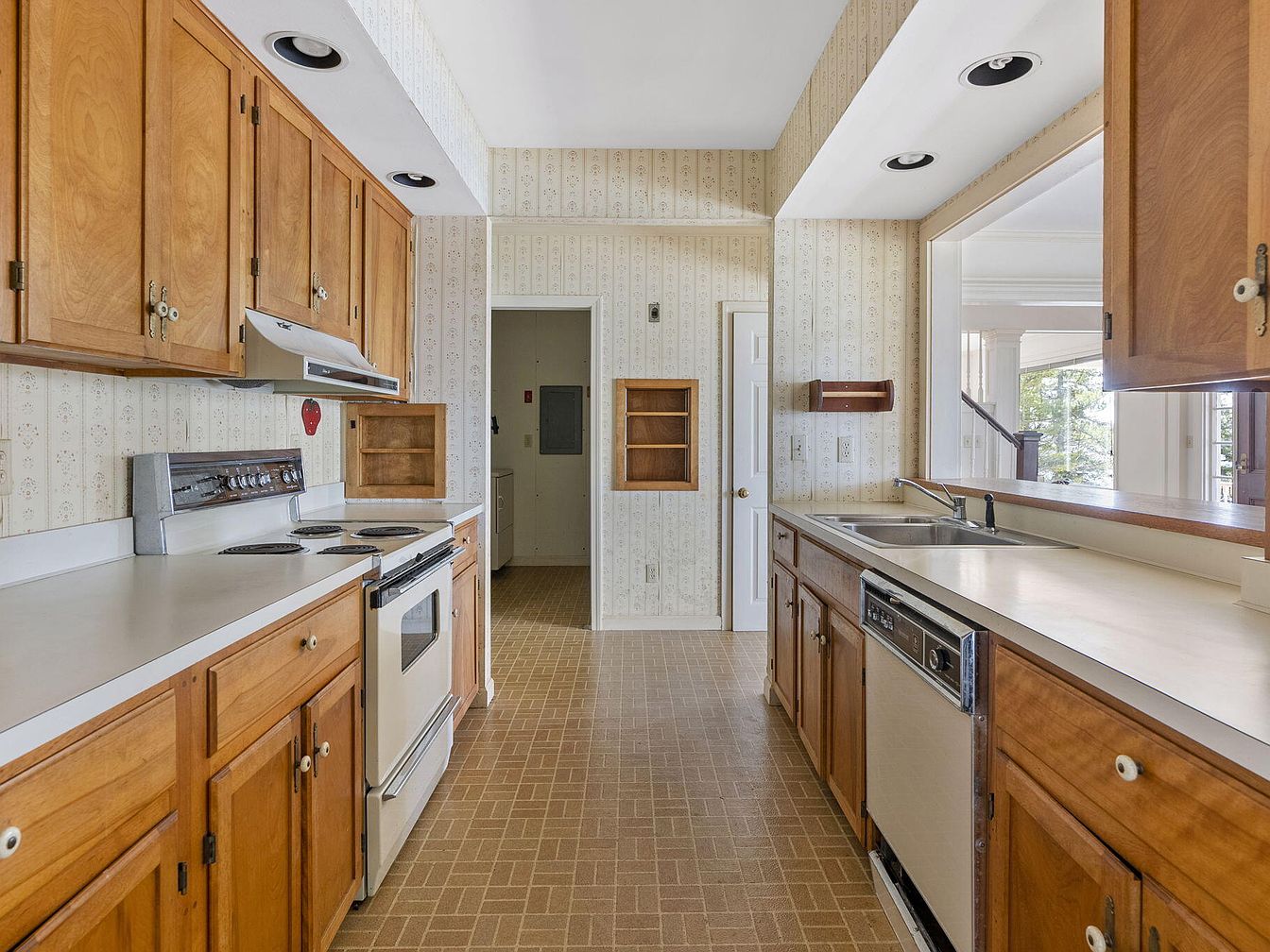 This kitchen features a functional layout, with wooden cabinets and a simple countertop design. The cabinetry is finished in a warm wood tone that complements the vintage wallpaper adorned with delicate floral patterns. A built-in stove and range hood are neatly integrated into the cabinetry, while a double sink sits beneath a window, allowing natural light to fill the space. The floor showcases a patterned linoleum that gently ties in with the kitchen’s aesthetic. A small shelf is mounted on the wall, providing additional storage or display options, while the overall atmosphere is welcoming and reminiscent of classic American homes.