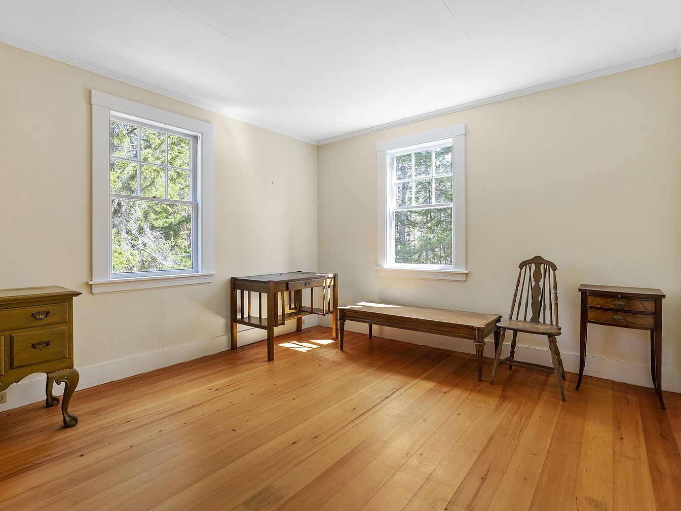 This living room features a warm, inviting atmosphere with natural light streaming in through two large windows, framed by simple white trim. The walls are painted a soft beige, complementing the rich, honey-toned hardwood floor that showcases beautiful grain patterns. The furnishings consist of a charming small table with slender legs, a long bench, and a classic spindle-back chair, all crafted from wood. A small, elegant nightstand adds character to the space. The overall aesthetic is rustic yet refined, combining traditional elements with a cozy, lived-in feel, ideal for relaxation or conversation.