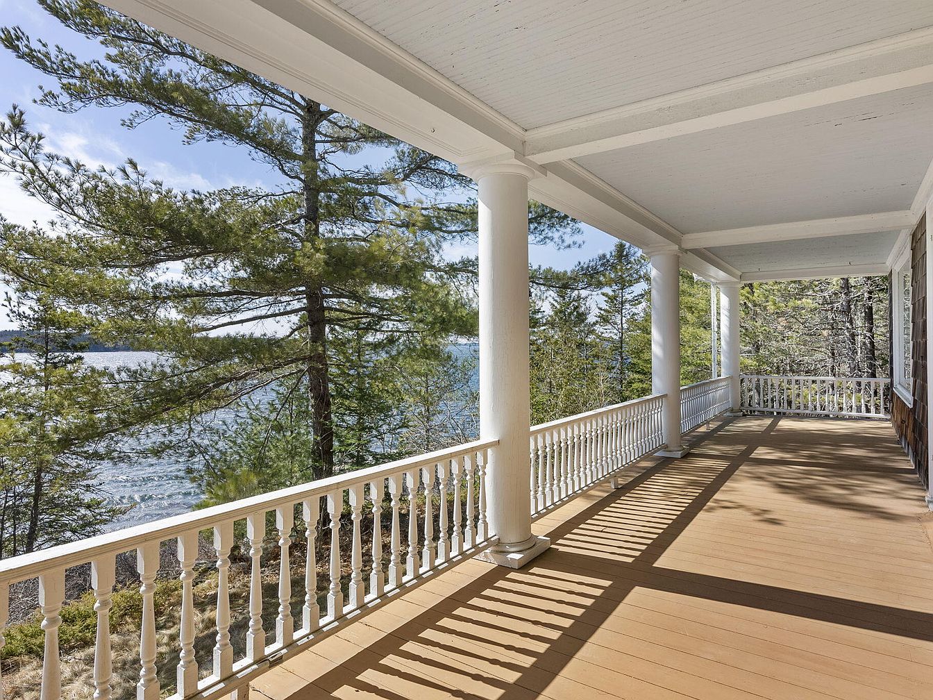 A spacious front porch features elegant white railings and tall, cylindrical columns that lend a classic charm. The wooden flooring is smooth, stained in warm tones, enhancing the inviting atmosphere. Natural light floods the space, casting intricate shadows on the ground. Surrounding pine trees create a lush backdrop, harmonizing with the serene lake visible in the distance. The roof extends outward, offering shelter while maintaining an airy feel. The design integrates both traditional architecture and natural elements, encouraging relaxation and contemplation of the surrounding landscape, which beautifully connects indoor and outdoor environments.