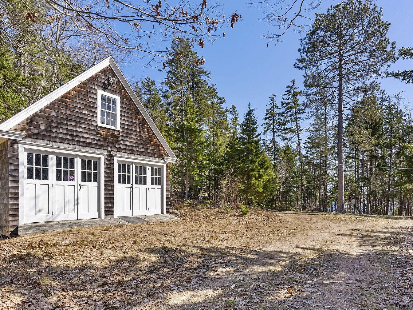 The image showcases a charming garage, featuring wooden shingles on the exterior that blend harmoniously with the surrounding natural setting. The structure is peaked, drawing attention to the symmetrical design and a central window that adds a touch of character. Two white garage doors, framed with large glass panes, provide a vintage appeal, complemented by sleek black handles. The landscape includes a mix of tall evergreen trees and scattered brush, enhancing the rustic ambiance. The area is clear of clutter, with a gravel path leading to the garage, embracing tranquility and inviting exploration into the wilderness beyond.
