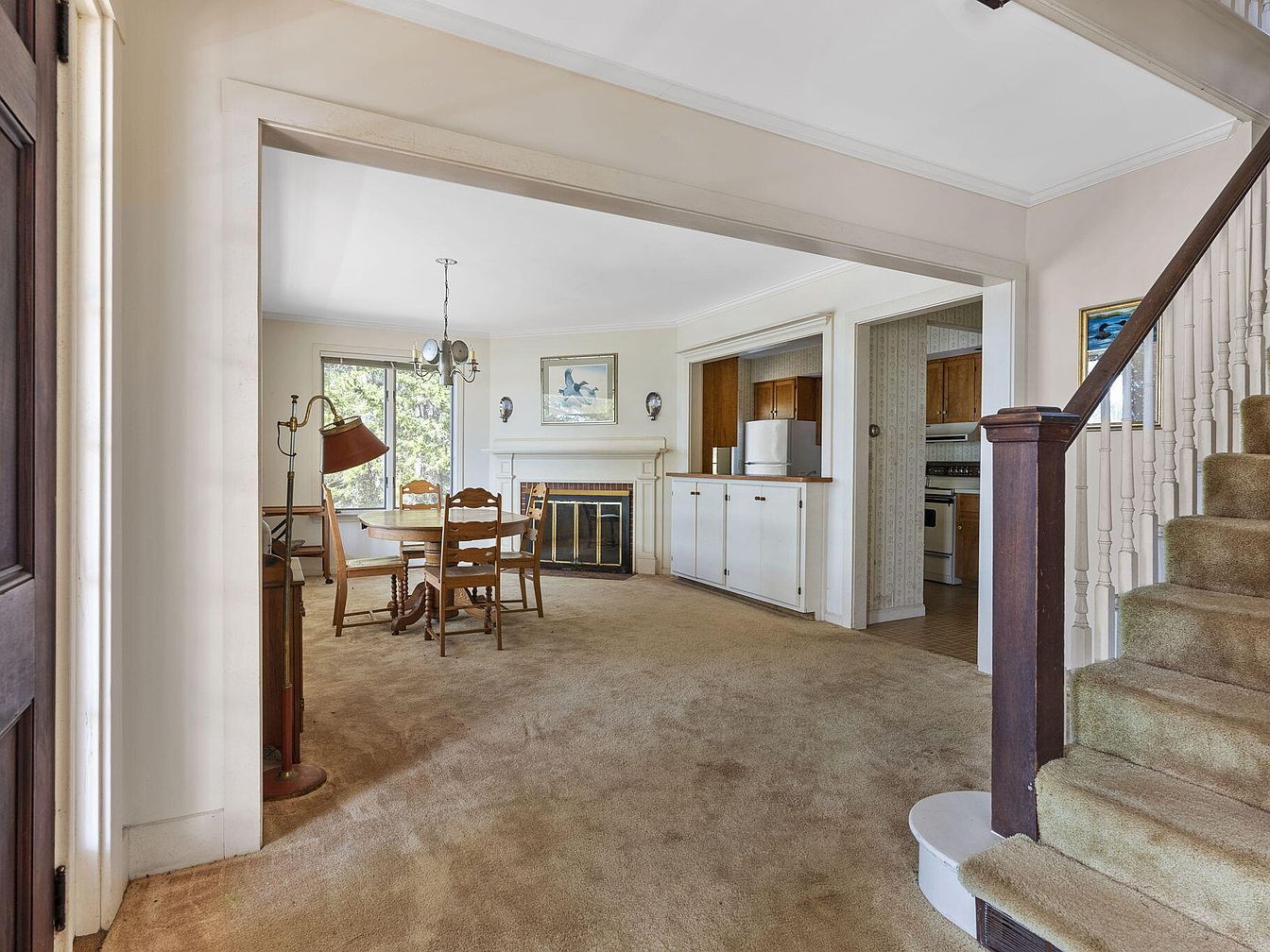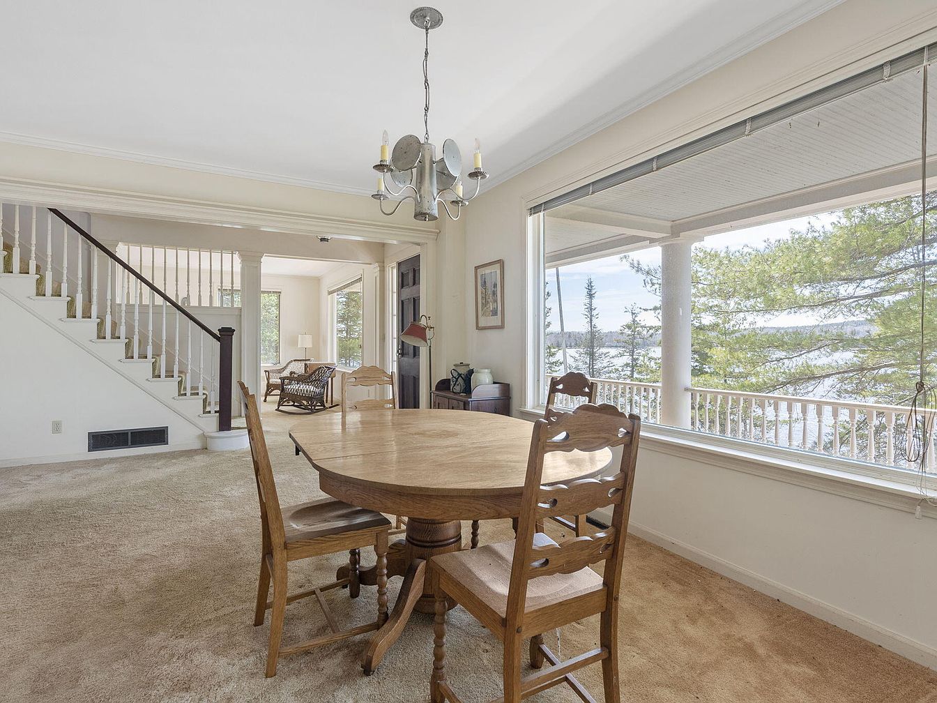 This dining area features a simple wooden table surrounded by matching chairs, evoking a rustic charm. The soft beige carpet complements the light-colored walls. A large window stretches along one side, framing serene views of nature, enhancing the space with natural light. A vintage chandelier with three bulbs hangs above the table, adding elegance. The staircase in the background showcases classic wooden railings leading to an upper level, contributing to traditional architectural elements. Subtle decor, such as framed artwork, adds personal touches while maintaining an uncluttered atmosphere, perfect for gathering and enjoying meals.