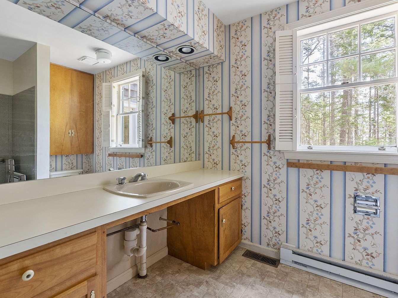 This vintage bathroom features floral wallpaper adorned with blue stripes, creating a soft, inviting atmosphere. A long, white countertop hosts a simple sink, complemented by wooden cabinetry beneath. The cabinetry has a natural wood finish, providing warmth to the space. To the left, a large mirror enhances light and offers a glimpse of the room’s spaciousness, while the window lets in natural light, framing serene views of trees outside. Wood shelving is mounted on the walls, ensuring functionality, while the flooring possesses a light-colored tile design, contributing to the overall bright ambiance.