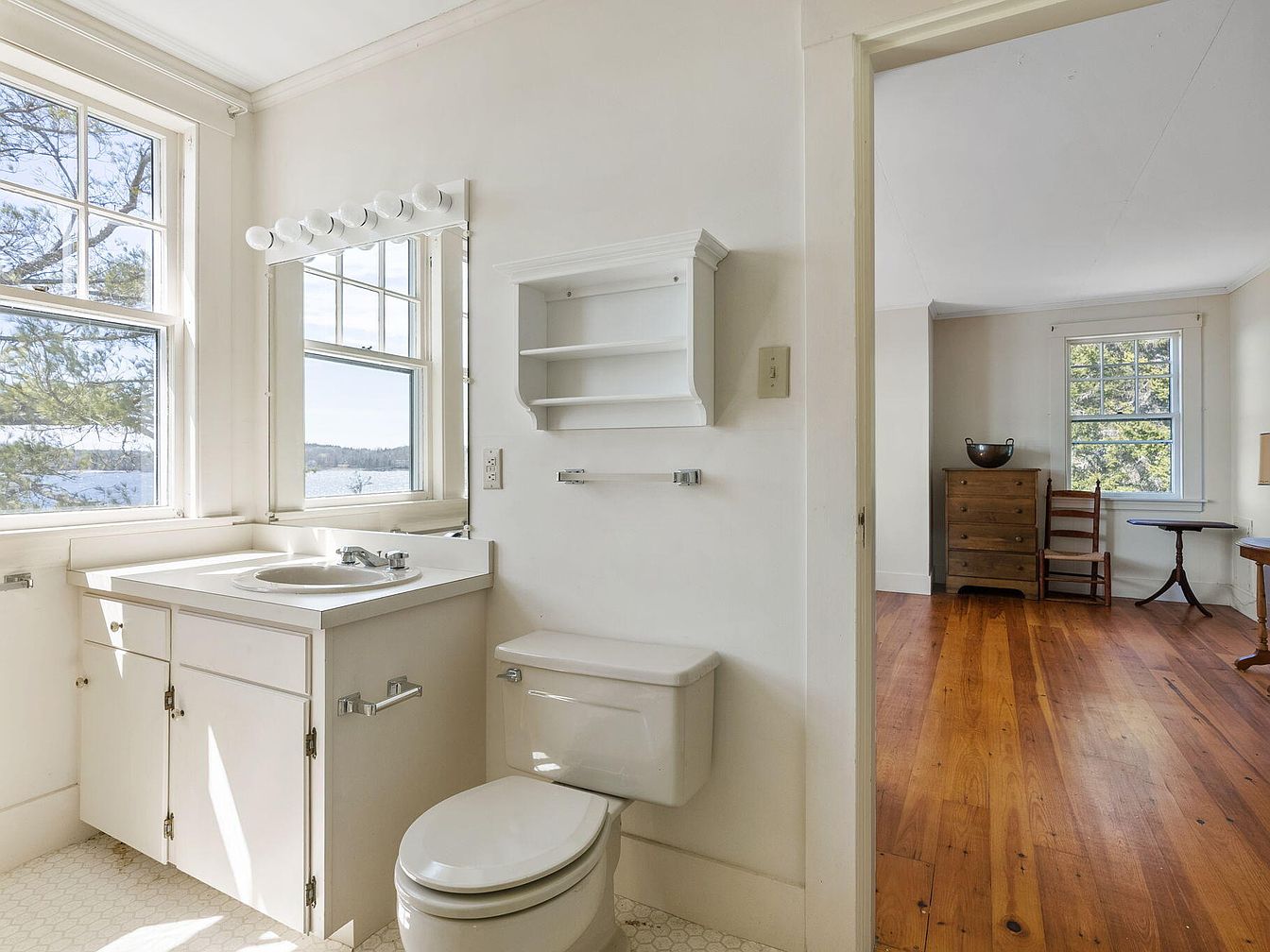 This bathroom features a clean white color scheme, enhancing its bright and airy feel. A modern sink counter with storage cabinets sits below a large mirror, illuminated by a row of globe lights. Natural light pours in through two expansive windows, showcasing a serene view. The walls are painted a crisp white, complementing the light-colored hexagonal tile flooring. A compact white toilet provides functionality, while simple shelves offer space for toiletries. Beyond, glimpses of another room can be seen, with rich wooden floors, suggesting a seamless transition between spaces, blending functionality and classic design.