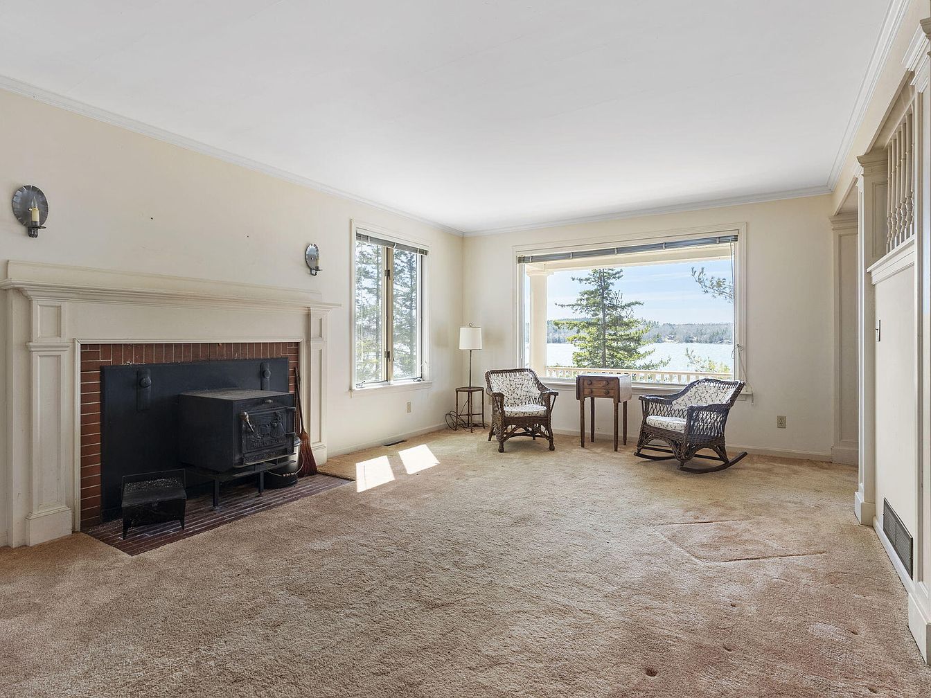 The living room features a spacious layout with a soft beige carpet, enhancing warmth and comfort. A classic brick fireplace, framed by white woodwork, serves as a focal point, complemented by an old-fashioned wood stove. Large windows allow natural light to flood the space, offering serene views of the outdoors. Two wicker chairs flank a small wooden table, ideal for intimate conversations. A simple floor lamp adds subtle illumination, while wall sconces present a vintage touch. Architectural details include crown molding along the ceiling, blending traditional style with a cozy ambiance.