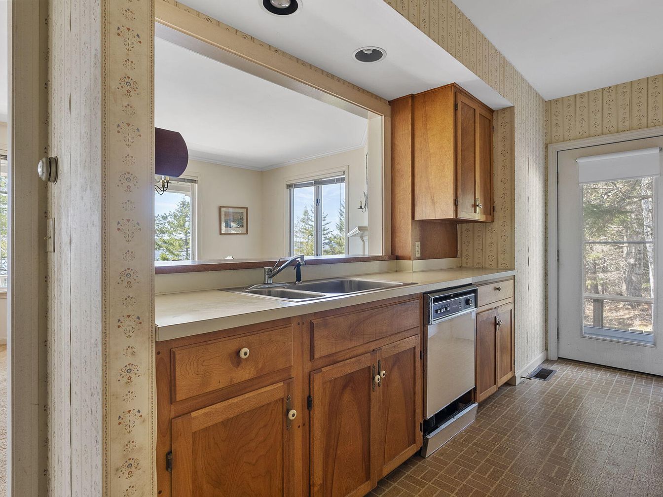 This kitchen space features warm wooden cabinetry with a rich, natural finish, providing a classic and inviting atmosphere. The countertops are simple and functional, complemented by a stainless-steel dishwasher and sink. Above the sink, a large window allows for natural light, offering views of the outdoors, enhancing the room’s openness. The patterned wallpaper in soft beige tones adds subtle elegance, while the light fixture above introduces a vintage touch. The flooring, with a geometric tile pattern, grounds the space seamlessly, creating a cozy yet practical cooking environment. Overall, it combines vintage charm with modern convenience.