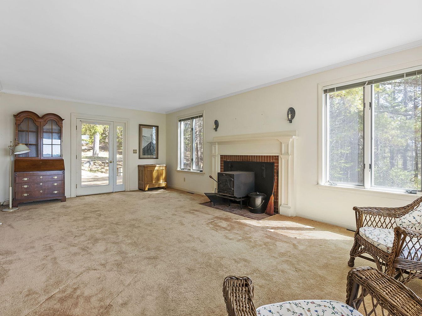 This living room exudes a cozy, vintage charm complemented by soft beige carpeting and neutral walls that enhance natural light streaming through large windows. A classic fireplace adorned with a white mantel serves as a focal point, accompanied by a sleek wood-burning stove. Nearby, a combination of antique furniture pieces, including a glass-fronted china cabinet and a polished wooden side table, reflects traditional aesthetics. Wicker armchairs with floral patterns invite relaxation. Subtle architectural details like crown molding and wall sconces add character, while views of surrounding trees create a serene, inviting atmosphere.