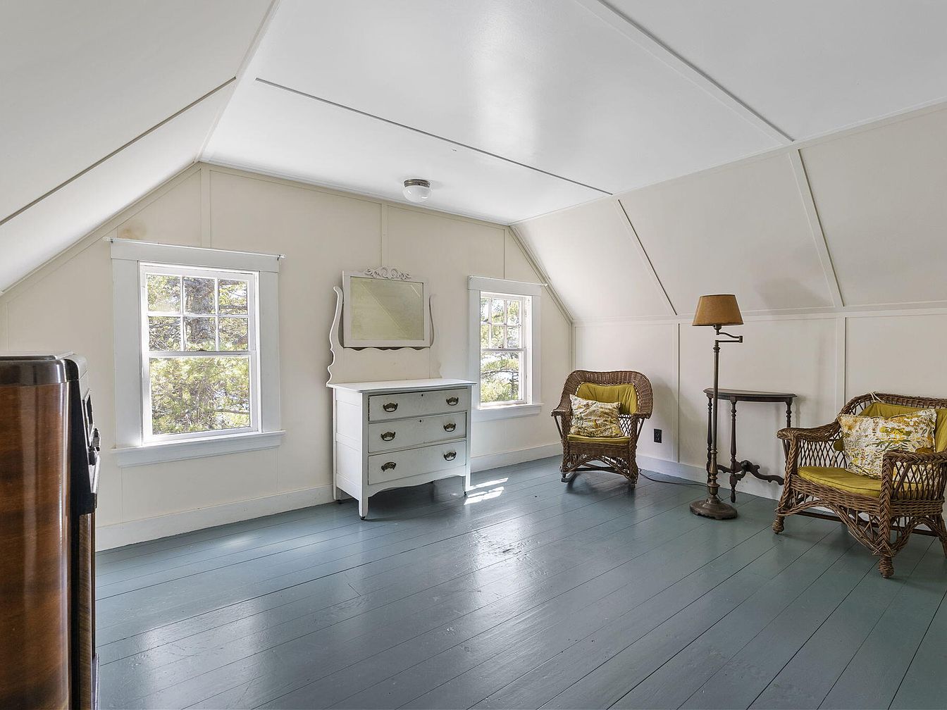 This cozy attic space features a sloped ceiling, enhancing its inviting charm. The walls are painted in soft whites, while the floor showcases a soothing blue hue, adding a touch of serenity. A vintage white dresser sits elegantly against one wall, complemented by an ornate mirror above, creating a focal point. Two wicker chairs with vibrant yellow cushions provide comfortable seating, while a slender side table with a stylish lamp stands nearby for ambient lighting. Large windows invite natural light and offer views of the surrounding greenery, adding brightness and tranquility to this serene retreat.