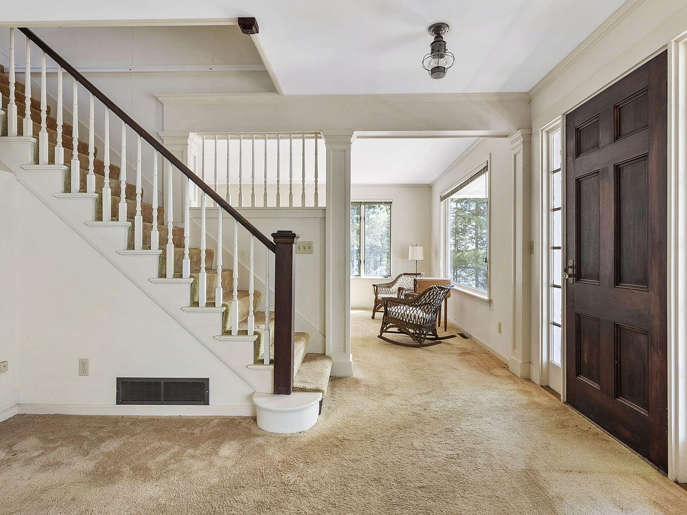 The entryway features a blend of classic and contemporary design. A staircase with a dark wooden handrail and white spindles leads to the upper level, accentuating vertical space. The flooring is plush beige carpet, providing warmth underfoot. To the right, a sturdy dark wooden front door opens into a light-filled area with large windows framing views of nature. Two wicker rocking chairs offer a cozy seating option, complemented by a small lamp that adds a soft glow. Architectural elements like crown molding and a vintage style light fixture enhance the space’s charm, creating an inviting entrance into the home.