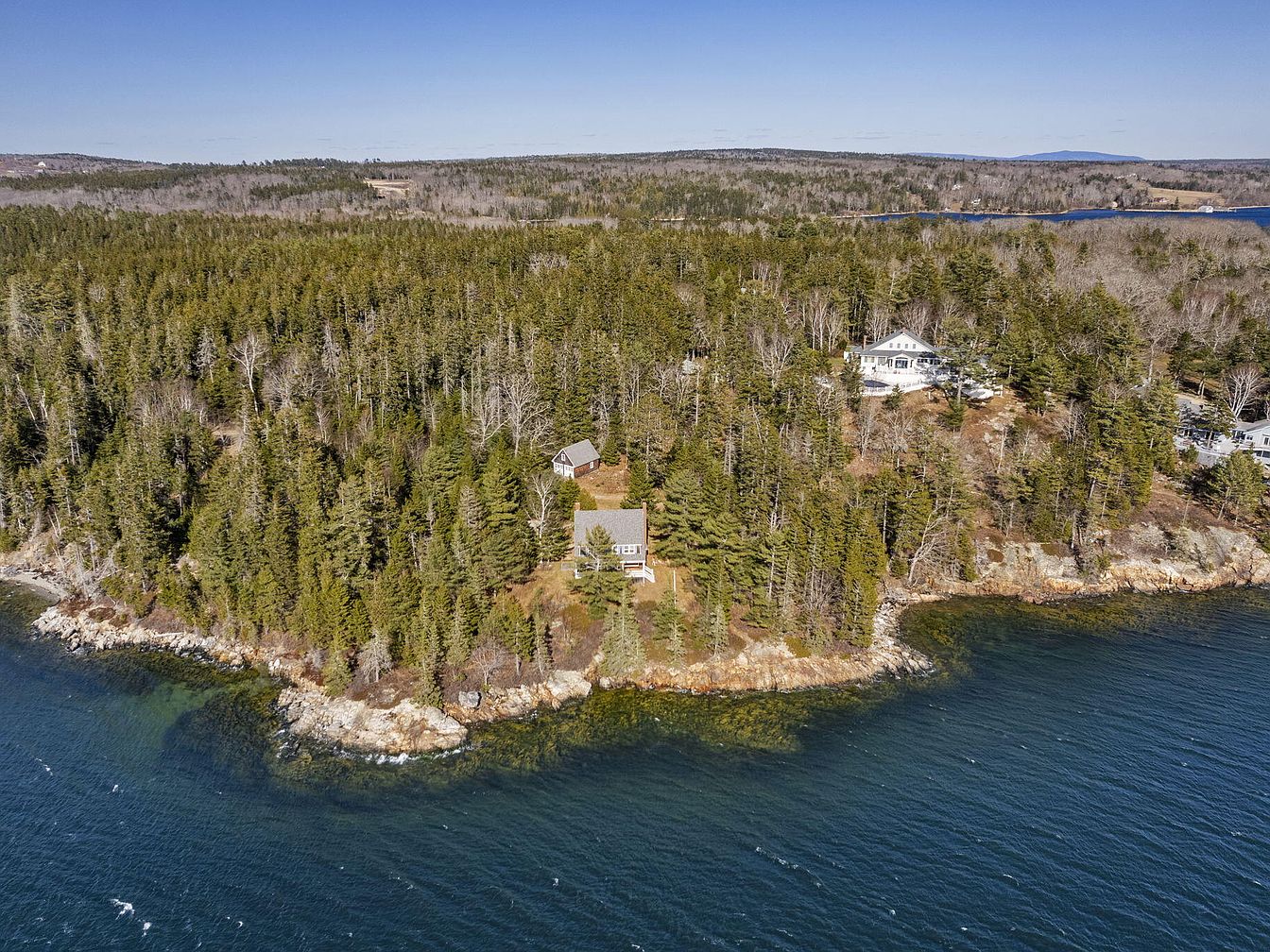 Aerial view of a coastline featuring lush greenery and rocky shoreline. Dense trees blanket the landscape, with pine and deciduous varieties dominating the scene. The water is a vibrant blue, revealing rocky outcrops and shallow areas near the shore. A few homes are subtly integrated into the natural surroundings, with a prominent white house standing out against the greenery. The layout emphasizes serene, natural beauty, with uninterrupted views of the water and forested hills in the background. The overall aesthetic reflects tranquil coastal living, harmonizing architecture with the landscape.