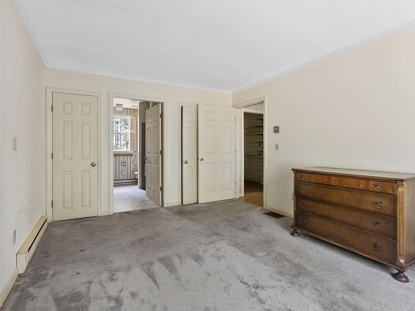 This bedroom features a cozy yet spacious layout, predominantly showcasing light beige walls paired with soft gray carpeting that creates a warm atmosphere. A vintage wooden dresser stands against the wall, its rich finish contrasting elegantly with the lighter tones. Multiple doorways hint at a larger layout, potentially leading to a closet and adjoining rooms. Sunlight streams through a window adorned with classic shutters, adding a functional yet aesthetic touch. Architectural details like crown molding and the slightly textured ceiling enhance the charm, while the overall arrangement invites personalization, allowing for a comfortable retreat.