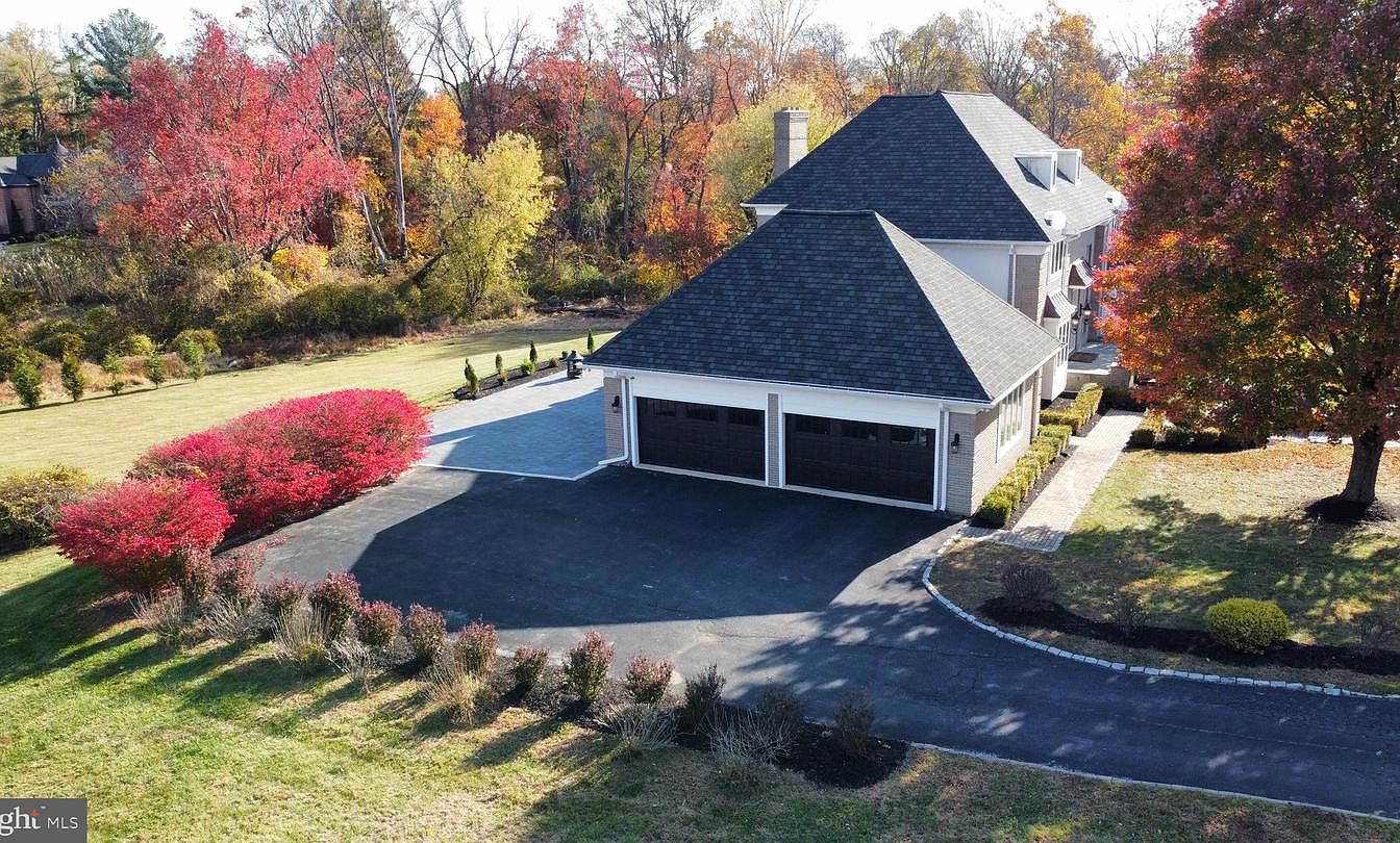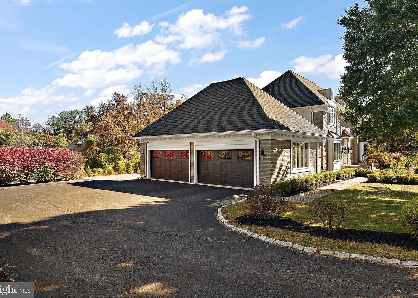 A spacious driveway leads to the house, framed by manicured landscaping. The facade features a combination of light-colored brick with dark wood accents. Two large garage doors with modern detailing are prominent. Surrounding the home, vibrant red and orange foliage highlights the changing seasons. Neatly trimmed hedges and ornamental grasses create visual interest, while a circular walkway connects to the entrance. The rooftop is steeply pitched with a charcoal gray shingle design, offering a classic silhouette. This exterior view captures the harmony between the house and its beautiful, colorful surroundings, emphasizing the spacious, inviting atmosphere.