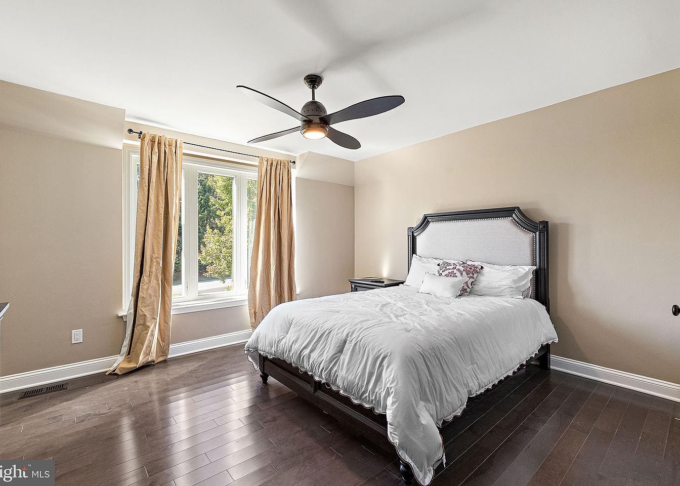 The bedroom features a spacious layout with dark hardwood flooring that adds warmth. A generously sized window, adorned with long, beige curtains, allows natural light to flood the space, illuminating the soft, neutral wall tones. Centered is a plush, white bed with an ornate black frame and a stylish upholstered headboard. Decorative pillows enhance the bed’s comfort and aesthetic appeal. A sleek nightstand, positioned beside the bed, complements the room’s modern style, while the ceiling fan overhead provides practicality without compromising the design. Overall, the room combines elegance and comfort, creating a serene atmosphere.