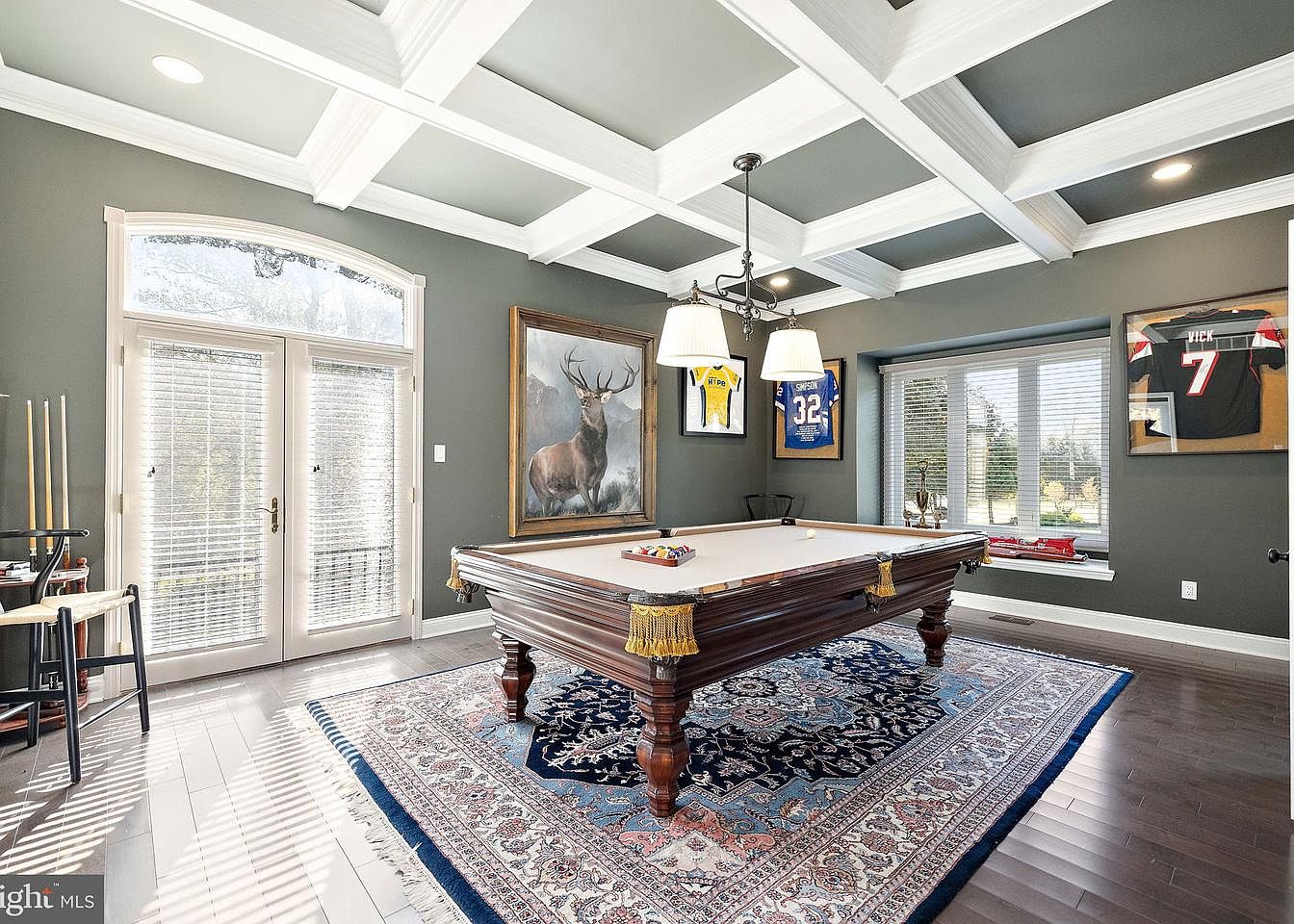 This game room features a luxurious pool table as the central piece, surrounded by a striking Persian-style rug in cream, blue, and red hues. The walls are painted a deep green, enhancing the warmth of hardwood floors. A coffered ceiling with white beams adds architectural interest. Two charming hanging lamps illuminate the table, creating a cozy atmosphere. Decor includes framed jerseys and a majestic deer painting, contributing a rustic charm. Large windows allow natural light, complemented by white blinds, while double doors lead outside, providing a seamless connection to the outdoor space.