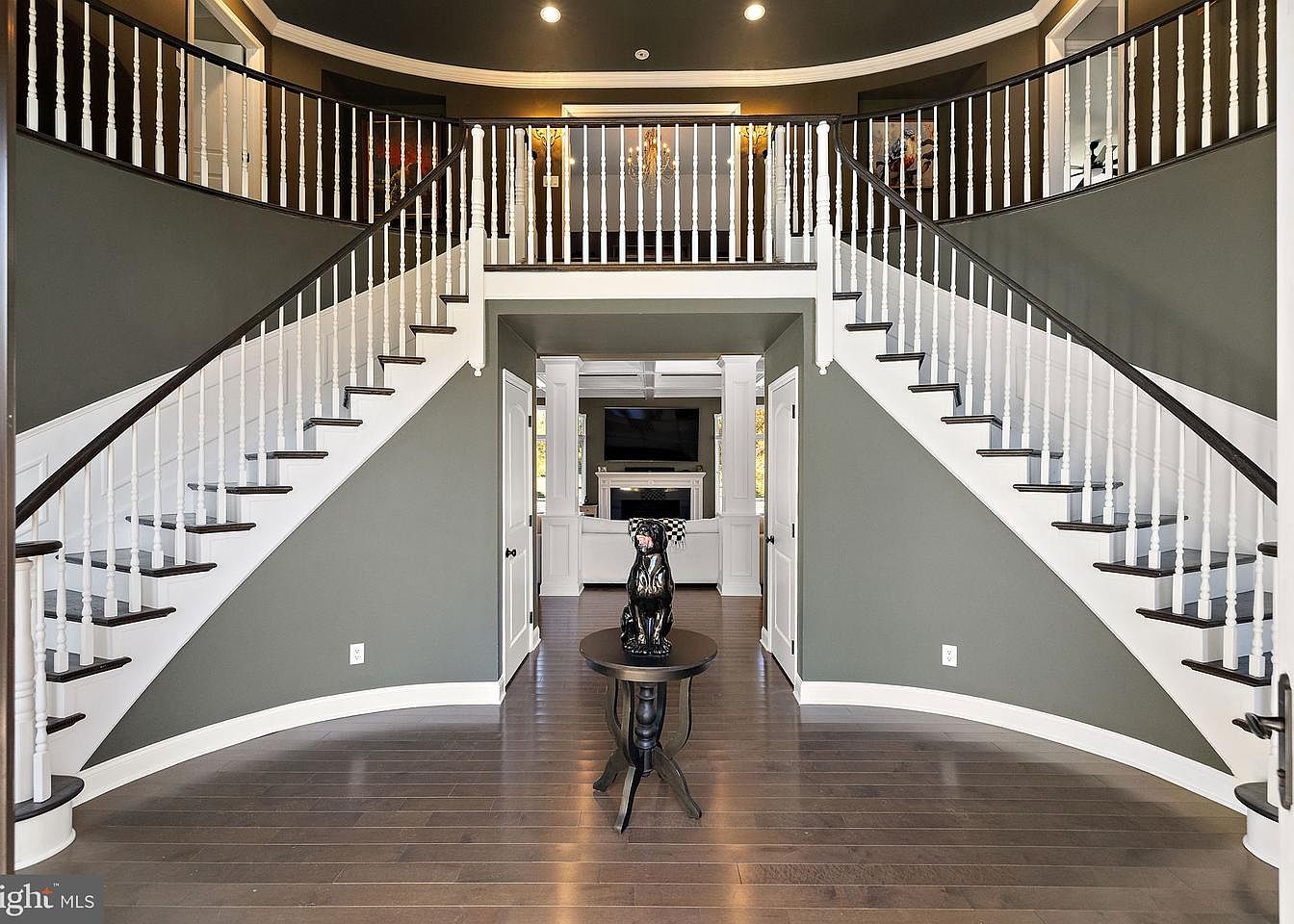 The entryway features a grand double staircase with gracefully curved railings, enhancing a sense of openness. The walls are painted in a muted olive green, providing a warm backdrop that complements the rich, dark hardwood flooring. A round black table stands prominently in the center, adorned with a sculptural black dog figure, adding a touch of modern whimsy. Above, recessed lighting highlights the intricate architectural details, including crown molding along the ceiling. The space is framed by elegant white woodwork, creating a striking contrast with the darker elements and inviting an air of sophistication.