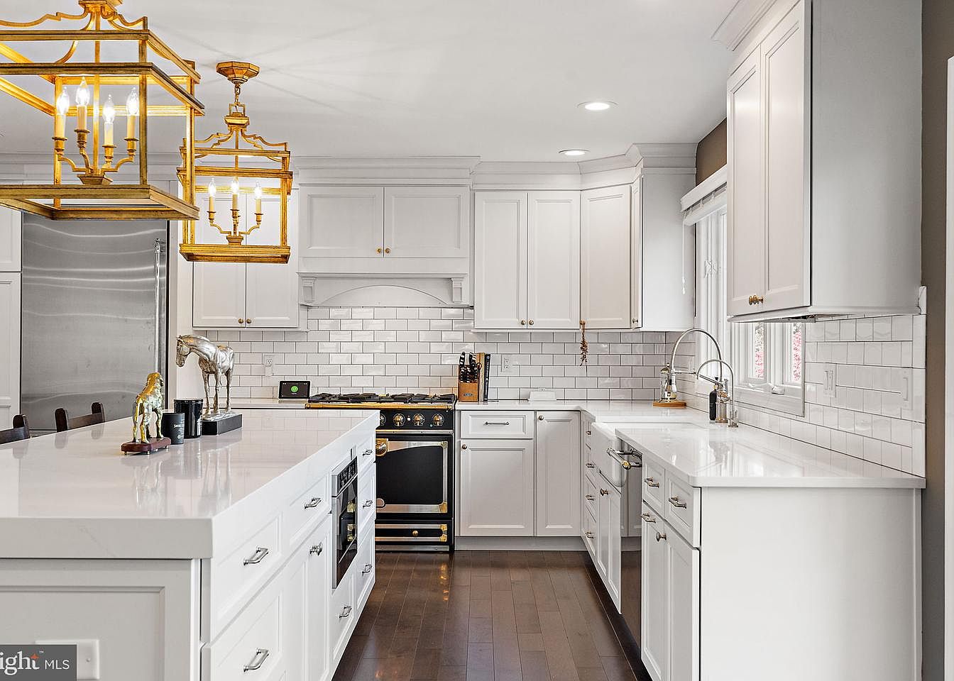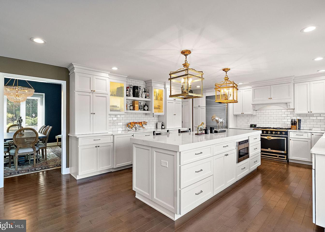 The kitchen features a spacious island with a sleek white surface, complemented by dark hardwood flooring. White cabinetry, equipped with polished nickel hardware, enhances the modern aesthetic. Two ornate gold pendant lights hang above the island, illuminating the space. The backsplash consists of glossy white subway tiles, adding a classic touch. Open shelves display curated décor and kitchenware, while a black range adds contrast against the white theme. A doorway to the left leads into a cozy dining nook, highlighted by a chandelier and dark blue walls, providing a stylish yet inviting transition between spaces.
