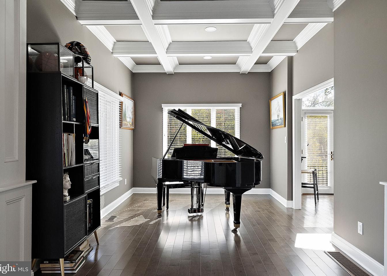 This elegant music room features a grand piano set against a backdrop of muted gray walls. The coffered ceiling adds architectural interest, enhancing the spacious feel. Natural light floods the space through oversized windows adorned with sleek blinds, illuminating the polished hardwood flooring. A black bookshelf, styled minimally, stands to one side, holding a few select decor items. Framed artwork reflects a classic aesthetic, providing pops of color against the neutral palette. To the right, a small illuminated entry leads to an adjoining space, completing the inviting ambience, perfect for music and relaxation.
