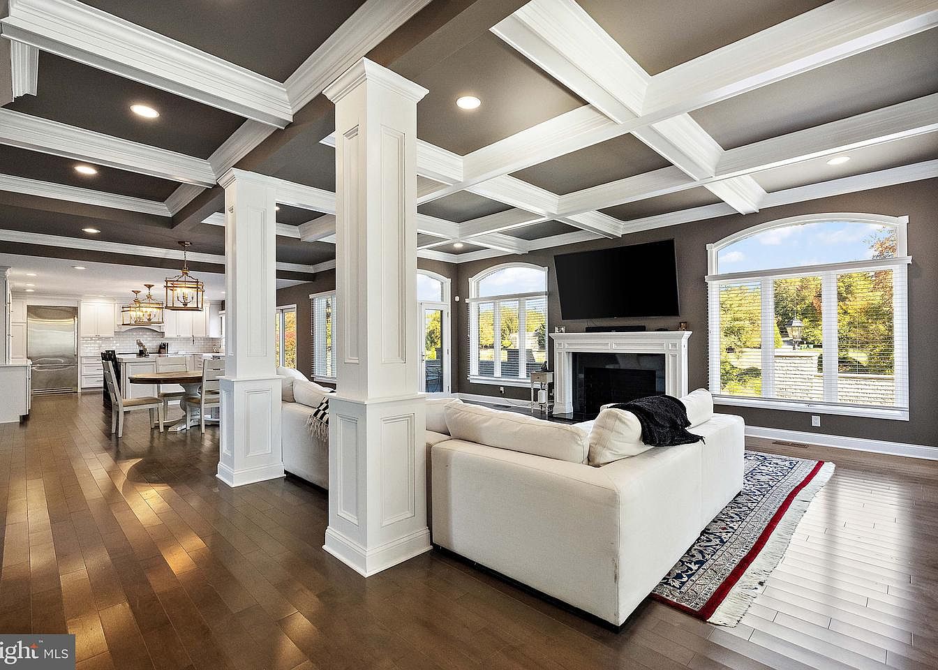 The living room features a spacious, open layout with coffered ceilings painted in a deep gray, contrasting beautifully with the white trim. Floor-to-ceiling windows bathe the area in natural light, accentuating the warm tones of the polished hardwood flooring. A sectional sofa in soft white invites relaxation, while a decorative area rug adds a touch of color. The fireplace, framed in elegant white molding, serves as a focal point beneath a mounted flat-screen television. A dining area with stylish light fixtures and a contemporary table completes the space, showcasing a blend of modern elegance and comfortable living.