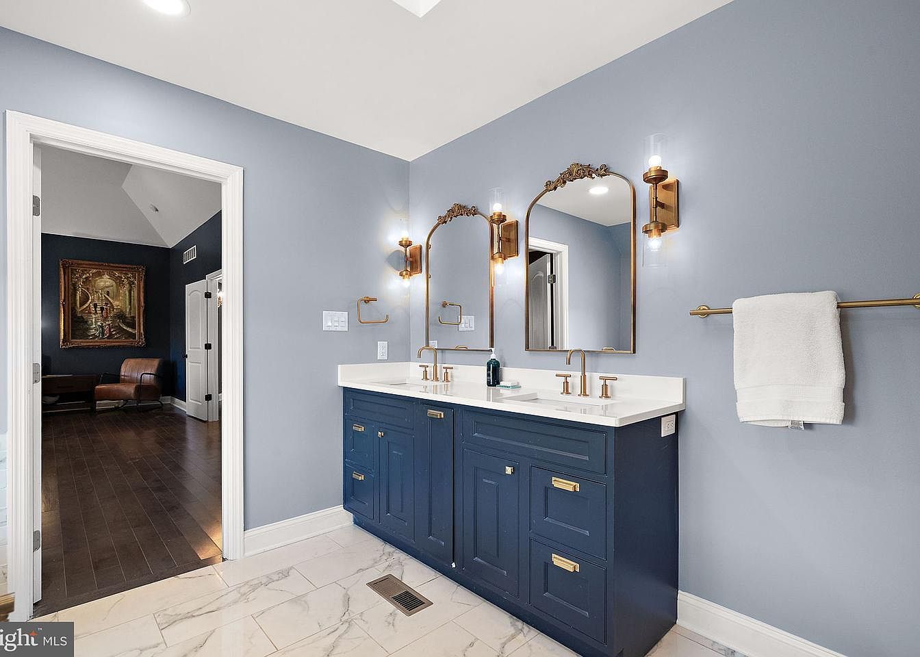 The bathroom features a chic dual-sink vanity with a rich navy blue cabinetry, accented by sleek brass hardware. A pristine white countertop highlights the minimalist design, complemented by elegant brass faucets. Above the sinks, ornate mirrors reflect soft light from contemporary sconces, adding warmth to the cool blue walls. The floor is adorned with large, luxurious marble tiles, accentuating a sense of sophistication. A doorway leads into an adjoining room, offering a glimpse of a cozy lounge area with dark wooden flooring and classic artwork, bridging modern design with historic charm.