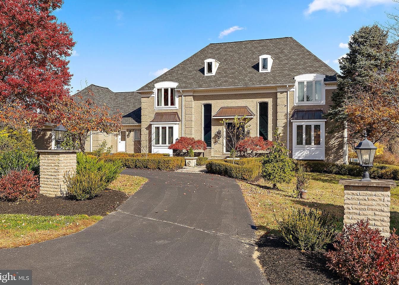 The entrance of a grand American home showcases elegant architecture, featuring a symmetrical facade with large, multi-pane windows framed by substantial brickwork. The dual dormers on the roof add character, while the metal awnings above the windows offer a touch of sophistication. Flanking the pathway, vibrant shrubs and ornamental trees create a lush landscape, contrasting with the neatly paved driveway. Soft earth tones of the home’s exterior harmonize with the rich greens and autumnal reds of the surrounding foliage, providing a welcoming yet refined aesthetic that highlights the beauty of the property.
