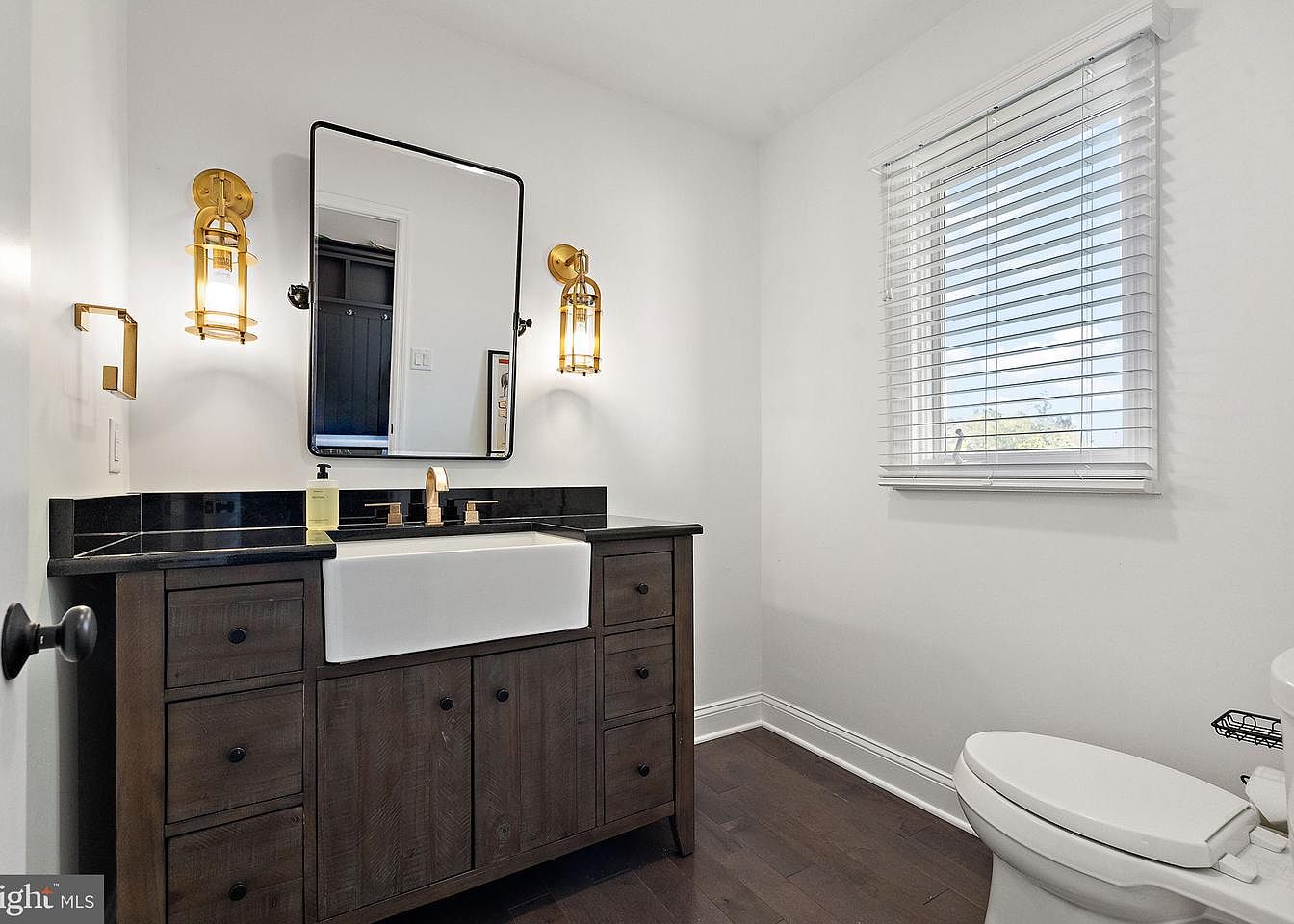A modern bathroom featuring a minimalist aesthetic. The space is illuminated by stylish wall sconces flanking a large, black-framed mirror, which reflects the brightness of the white walls. A dark wooden vanity with a farmhouse sink contrasts with the sleek black countertop, creating a chic and functional surface. Soft golden fixtures, including a faucet, add a touch of elegance. A subtle wood grain detail in the vanity enhances warmth, while the light hardwood flooring complements the overall design. Beneath a window with white blinds, natural light enhances this serene environment, making it inviting and stylish.