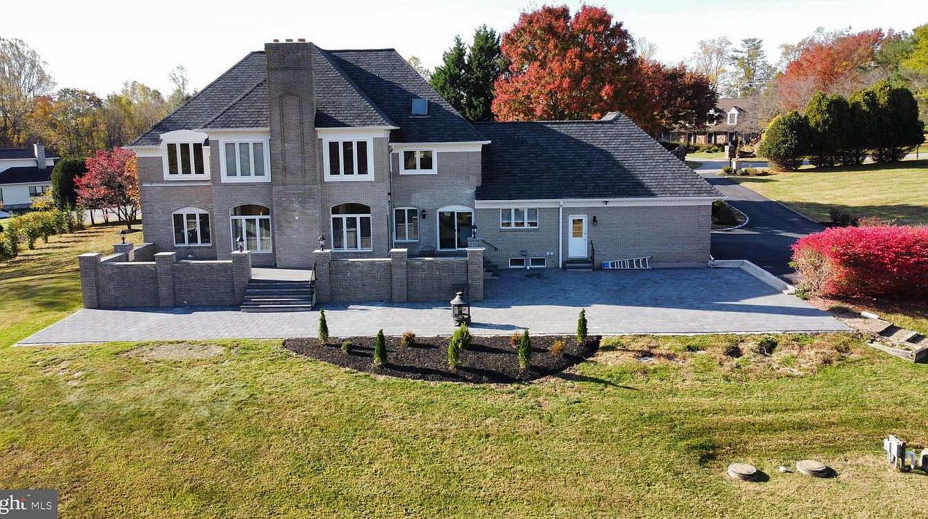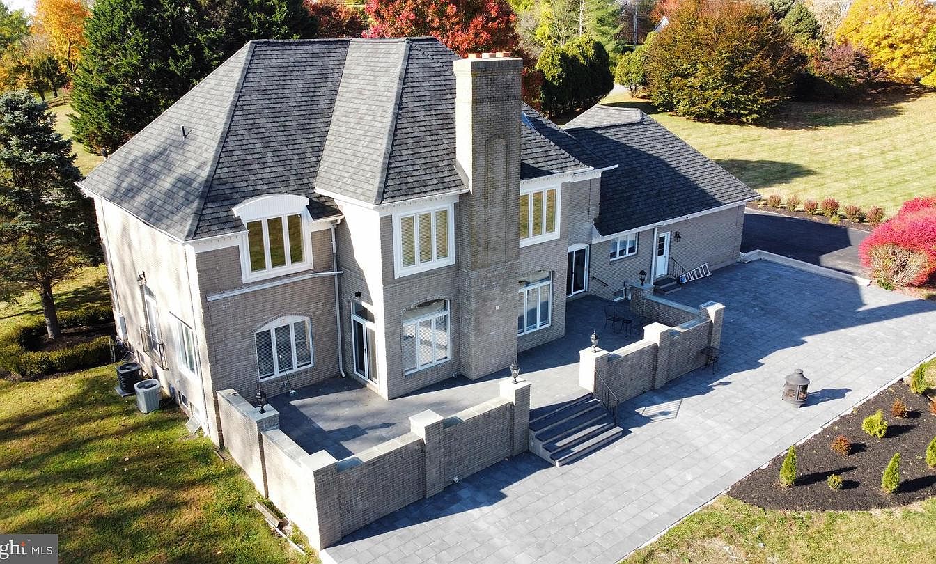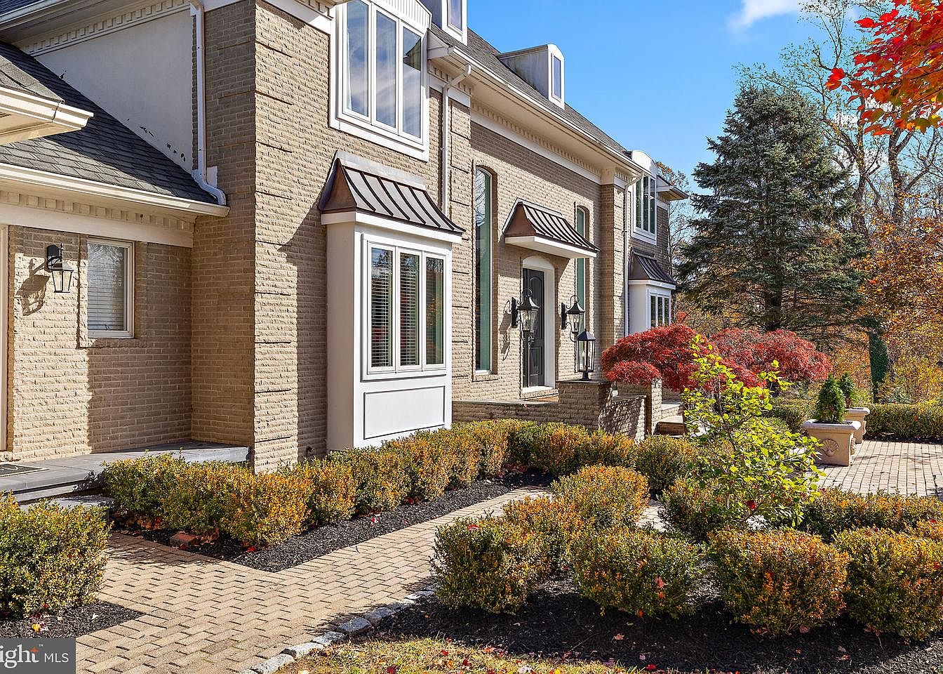 This patio area features a spacious layout with elegant stone paving, creating a seamless transition from the house to the outdoor space. The rear of the house showcases a symmetrical design, highlighted by large windows that allow natural light to fill the interior. A series of small, neatly arranged hedges border the patio, adding greenery against the brick exterior. The roof is steeply pitched, with dark shingles contrasting against the light-colored bricks. Surrounding trees exhibit vibrant fall colors, enhancing the visual interest of the scene. The intricate architectural details underline the home’s classic yet refined aesthetic.