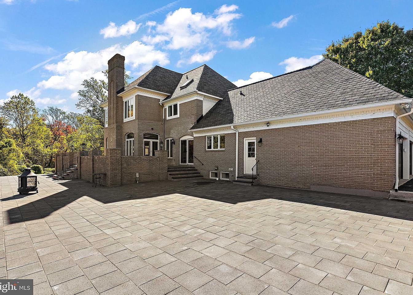 The patio features a spacious layout with rectangular stone pavers that create a clean and modern aesthetic. The house, primarily brick, is complemented by large windows and a prominent chimney, providing a classic yet contemporary look. The color palette includes warm earth tones from the bricks, harmonizing with the soft greens of the surrounding trees. Steps lead from the patio to a raised area, enhancing the visual interest. A few pieces of outdoor furniture add functionality, while the overall design invites social gatherings and outdoor relaxation, benefiting from abundant natural light and an open sky.