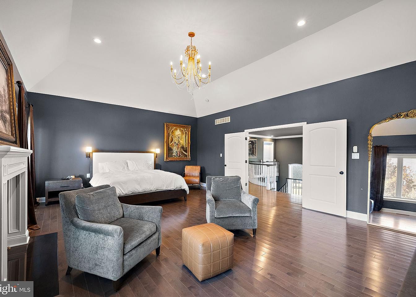 This spacious bedroom features a tall vaulted ceiling accentuated by a beautiful chandelier. The walls are painted a deep navy blue, creating a bold and intimate atmosphere. A large, plush bed with crisp white linens anchors the room. Flanking the bed are modern nightstands with sleek lighting fixtures. Two soft gray armchairs provide a cozy seating area beside a brown leather ottoman. Artwork hangs strategically on the walls, including an ornate framed piece that adds a touch of elegance. Light hardwood flooring complements the contemporary design while large windows invite natural light, enhancing the room’s warmth.
