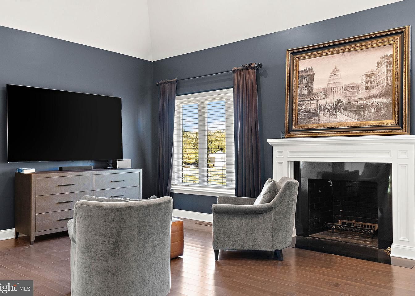 This living room showcases a contemporary yet cozy design, featuring deep blue walls that provide a striking backdrop. A sleek entertainment unit houses a large flat-screen television, complemented by a set of plush gray armchairs that invite relaxation. Natural light streams through a set of white-framed windows adorned with long, dark curtains, enhancing the space’s warmth. The room’s focal point is an ornate fireplace with a glossy black surround, topped by a vintage-style artwork that adds character. Warm wooden flooring unifies the design, creating a comfortable atmosphere ideal for both entertaining and quiet evenings.
