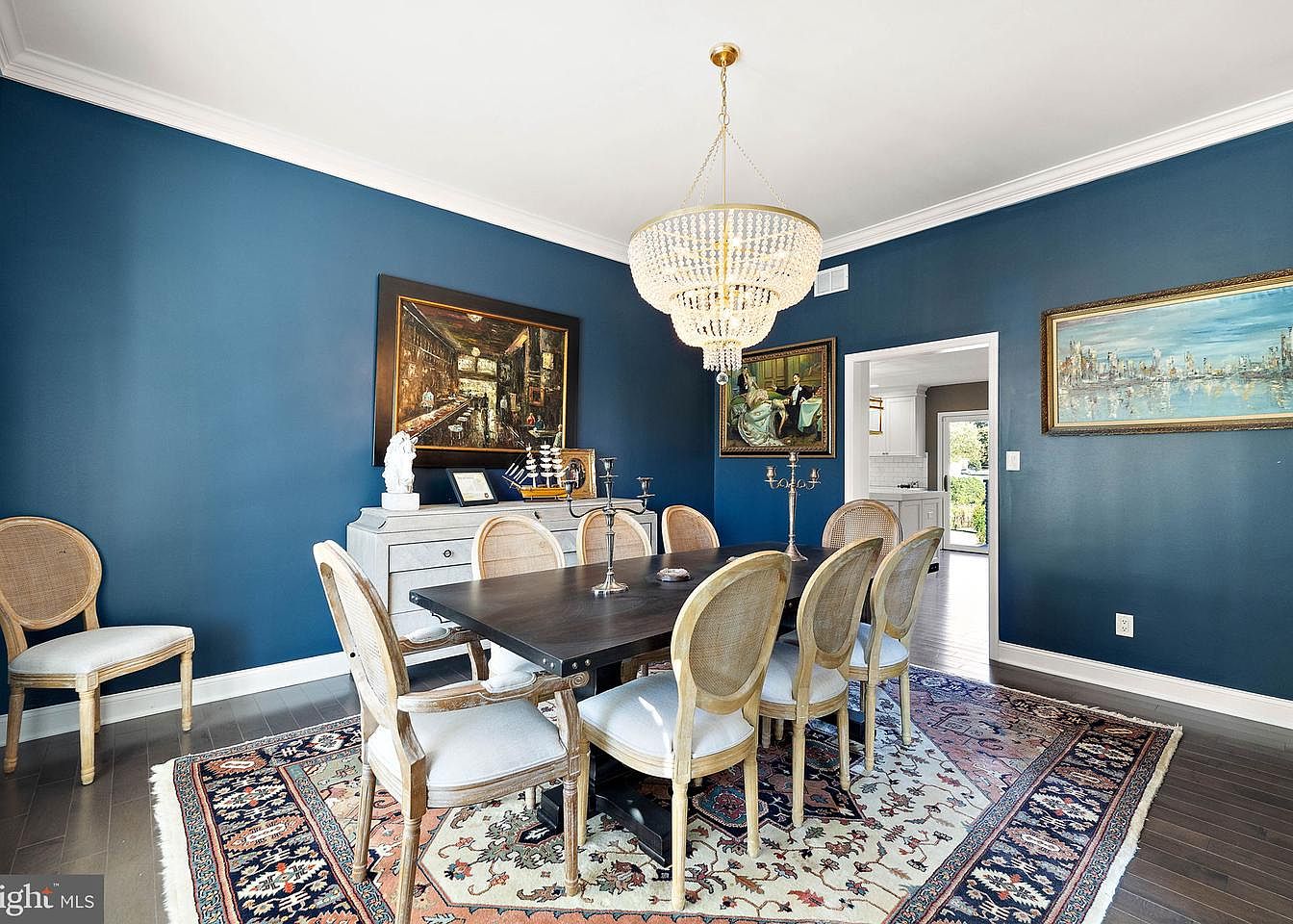 The dining room features rich navy blue walls that create a dramatic backdrop for the ornate crystal chandelier hanging from the ceiling. A sizeable dark wooden table is surrounded by elegant caned-back chairs, enhancing a sophisticated ambience. A traditional area rug in warm colors lies beneath the table, adding comfort and style. Artwork, including two classic paintings, adorns the walls and complements the overall aesthetics. A sleek sideboard in a light finish holds decorative items, balancing the room’s color palette elegantly. The large window beyond the doorway invites natural light, brightening the space.